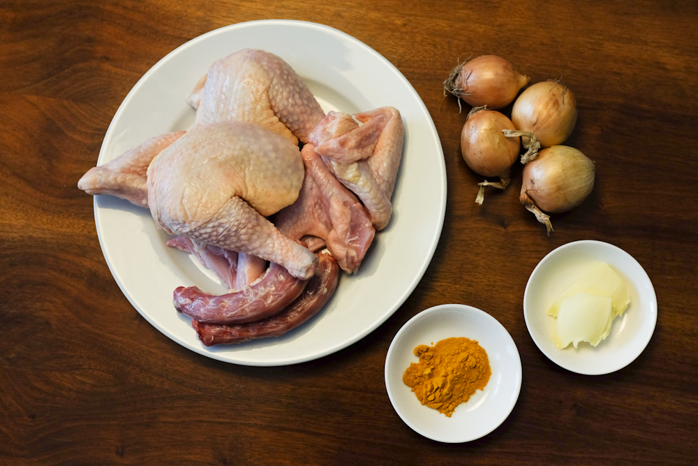 Zwiebeln schälen, in Längsstreifen schneiden und damit den Boden eines Kochtopfs bedecken. Die Butter und 1 EL Wasser hinzufügen. Darauf das in portionsgerechte Stücke zerteilte Hähnchen verteilen (da ich kürzlich 2 ganze Hähnchen gekauft und die übrigen Teile schon für andere Gerichte verwendet hatte, kamen in meinen heutigen Topf 2 Schlegel, 4 Flügel und 2 Hälse). Mit Salz, Pfeffer und Kurkuma bestreuen.