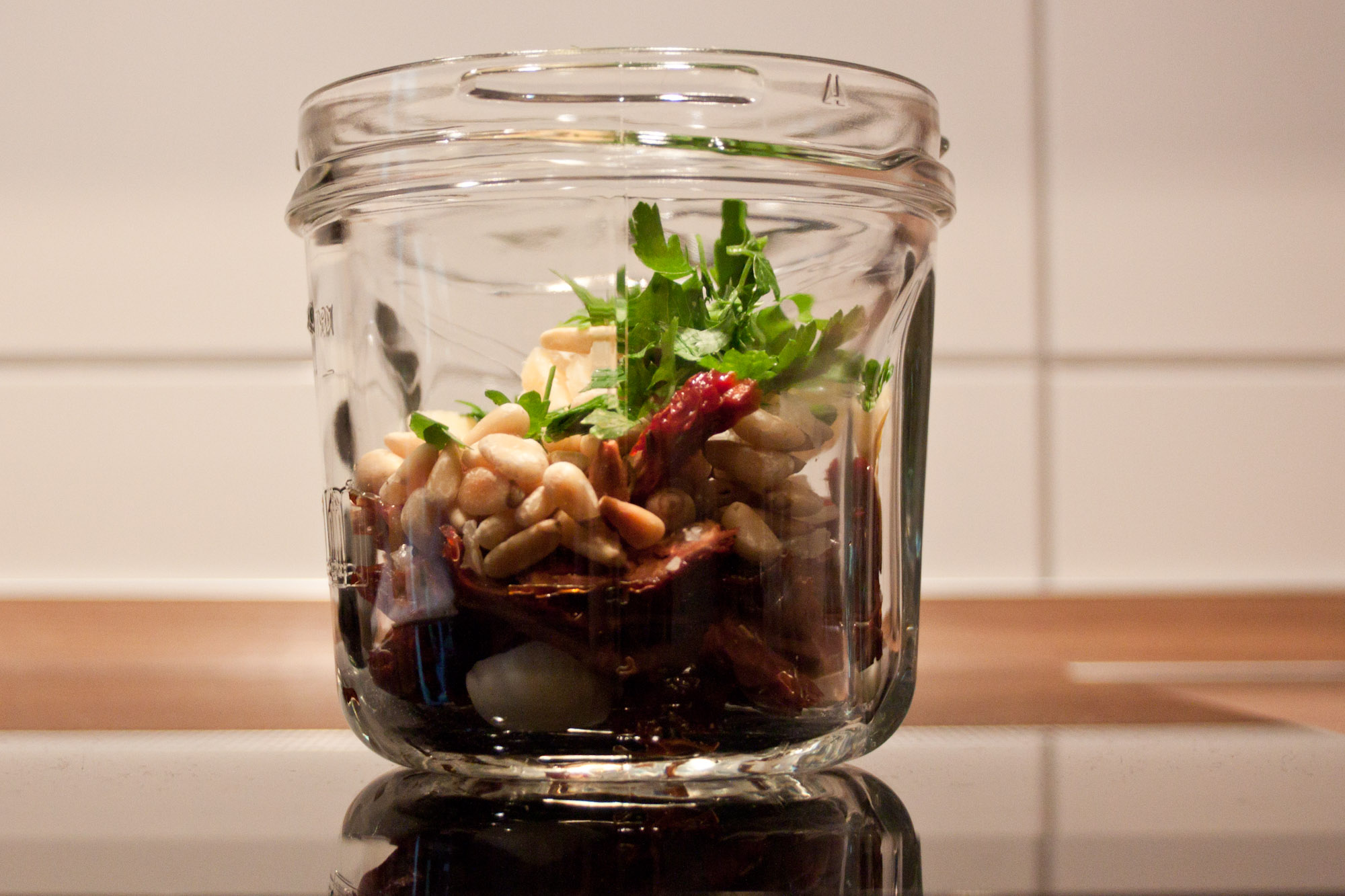 Getrocknete Tomaten in einem Sieb gut abtropfen lassen. Pinienkerne in einer Pfanne ohne Fett kurz anrösten und dann abkühlen lassen. Knoblauch schälen und in grobe Stücke schneiden. Parmesan in grobe Stücke schneiden. Tomaten in Stücke schneiden.