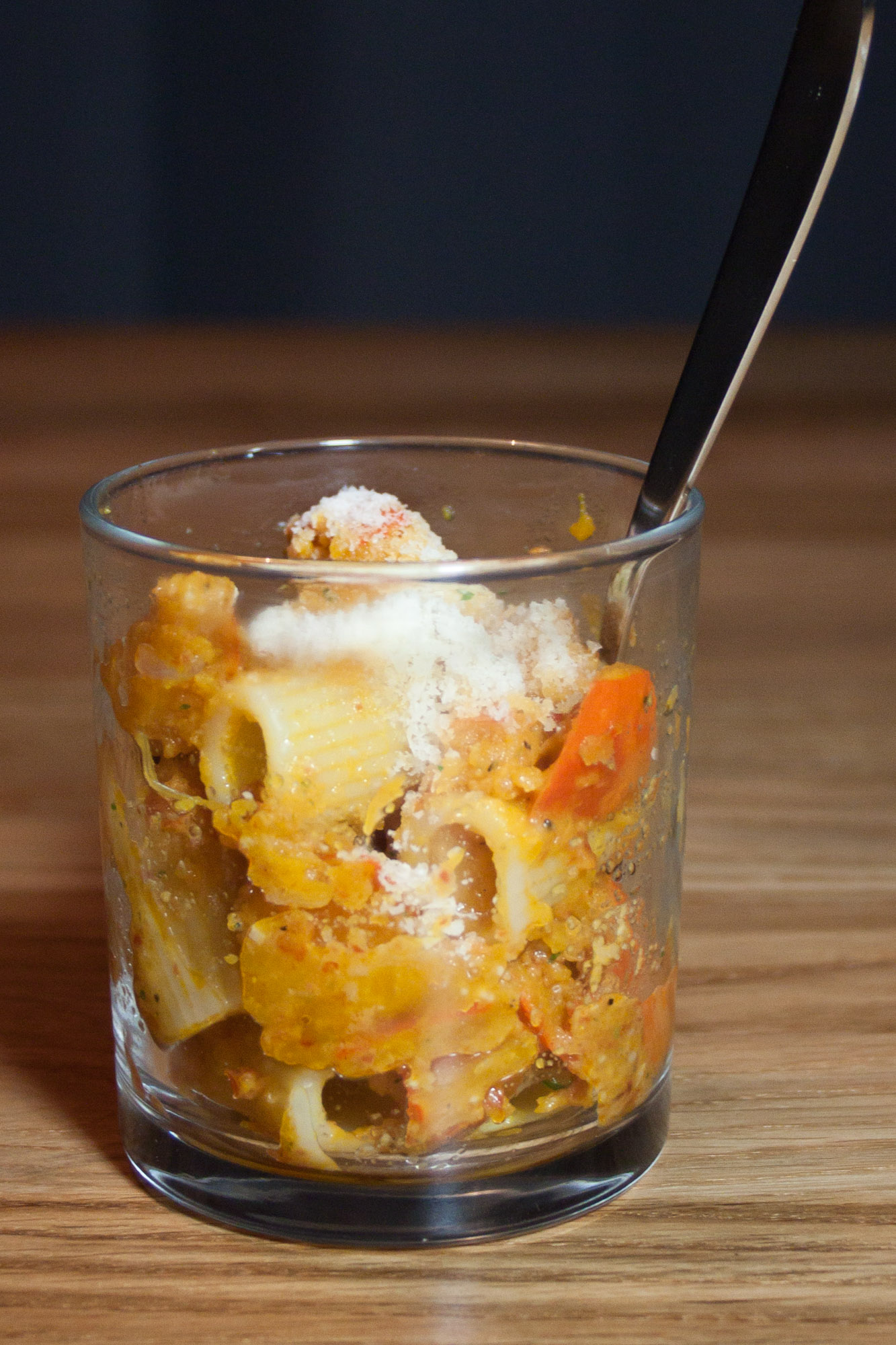 Dieses Gericht kann sowohl als Standalone-Pastagericht als auch in Gläschen im Rahmen eines Buffets serviert werden. Die Kürbis-Pasta schmeckt auch kalt sehr gut.