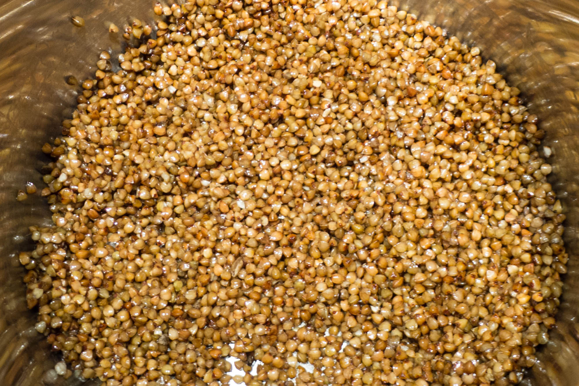 Der im Naturkostladen angebotene geschälte Buchweizen ist für dieses Gericht ungegeignet: er wird zu Brei. Für die Beilage, die wie gut zubereiteter Reis körnig bleibt, brauchen wir gerösteten Buchweizen. Er hat eine deutlich dunklere Farbe. Zu kaufen ist er in jedem russischen Supermarkt, wird jedoch auch in regulären Supermärkten angeboten, die ein Regal mit Artikeln russischer Küche führen, z.B. vielerorts im REWE.
