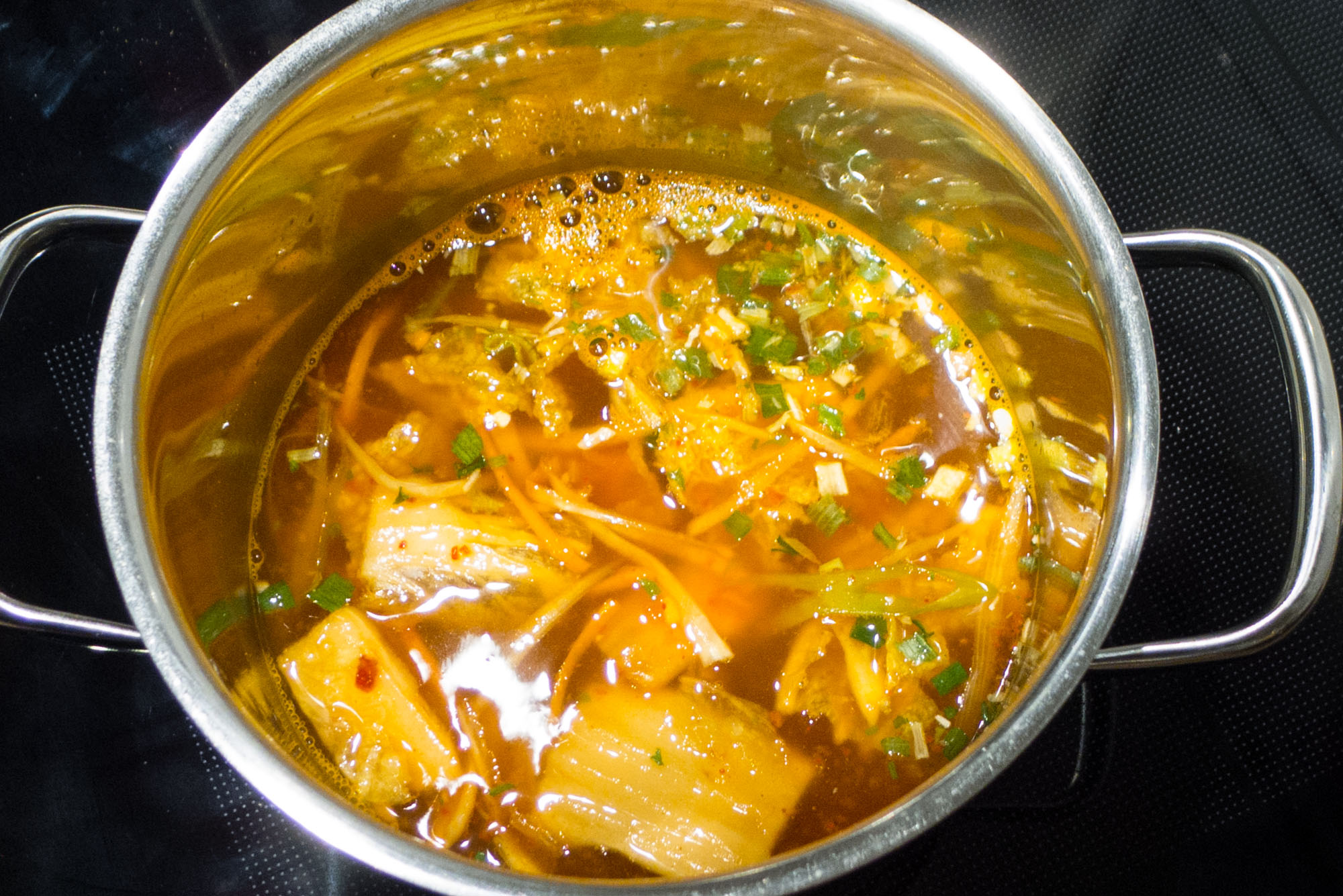 Das Eiweiß unter die Suppe rühren und versuchen dabei das Eigelb ganz lassen. Nun den Topfinhalt vorsichtig in eine Suppenschüssel umfüllen, oder authentisch im Topf lassen. Mit dem Grün der Frühlingszwiebeln bestreuen. Das Eigelb aufbrechen und über die Suppe laufen lassen. Sofort genießen. Das übrige Kimchi dazu essen.