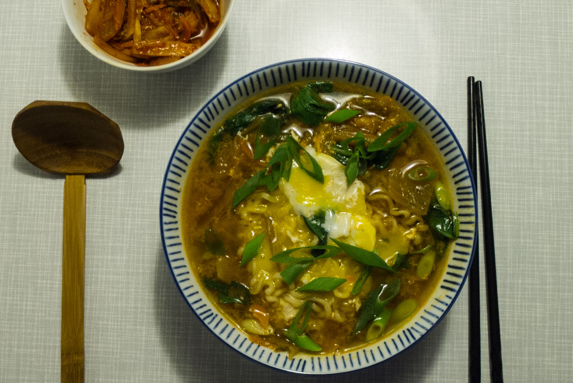 Ich füge meinen Ramyun immer Kimchi und ein Ei hinzu sowie variabel frische Beigaben, je nachdem was ich gerade vorrätig habe. Die Suppe wird dadurch nahrhafter, vitamin- und abwechslungsreicher. Kimchi ist ein fermentierter scharfer Chinakohl, das koreanische Pendant zu unserem Sauerkraut, das es in nahezu jedem Asialaden zu kaufen gibt.