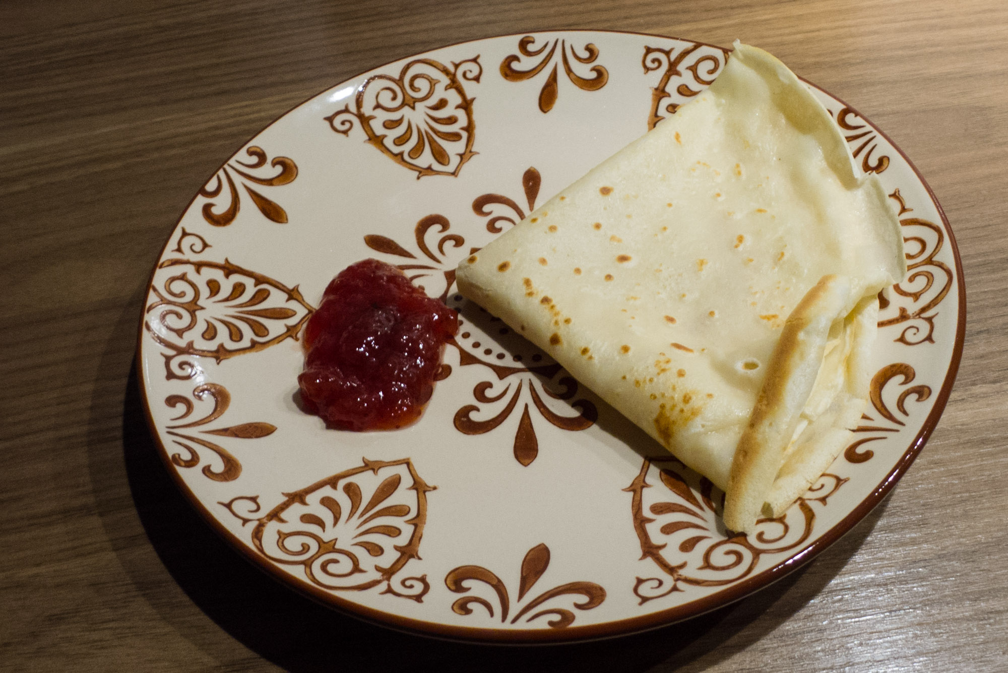 In die erhitzte und zu Beginn etwas eingefettete Pfanne eine knappe Suppenkelle Teig geben, die Pfanne sofort kreisend schwenken – der Teig muss sich über den ganzen Pfannenboden verteilen bevor er stockt.