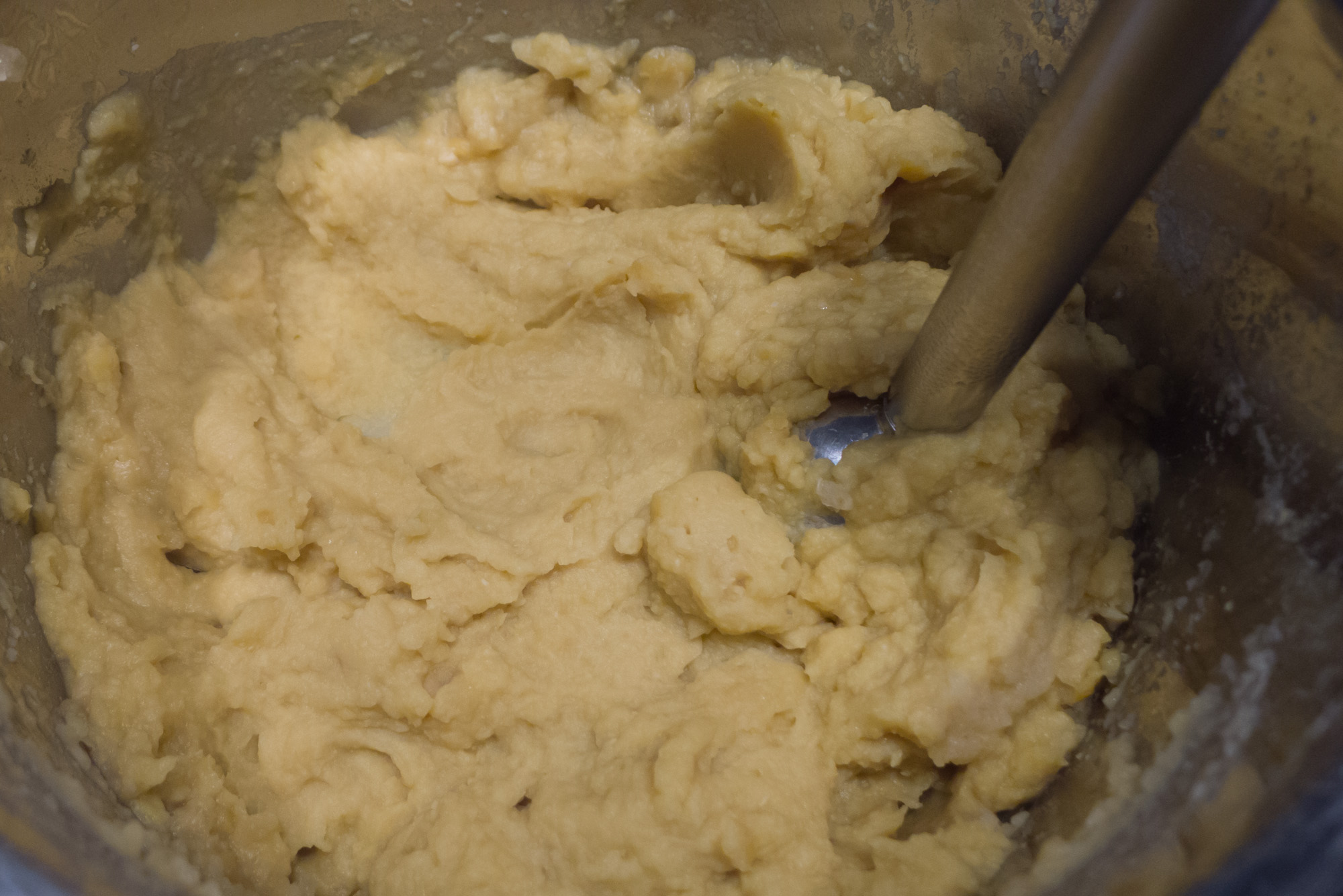 Dann auf leiser Flamme bei geschlossenem Deckel etwa 30 Minuten kochen lassen. Die Kochzeit variiert je nach Größe und Sorte der Kichererbsen: kleine sind schon nach etwa 20 Minuten gar, große brauchen evtl. 40 Minuten. Wenn die Kichererbsen gar sind, lassen sie sich mit einem Löffel zerdrücken. Kichererbsen abgießen und z. B. direkt im Kochtopf mittels Stabmixer pürieren. Es kann aber auch eine Küchenmaschine oder eine Gabel zum Einsatz kommen.