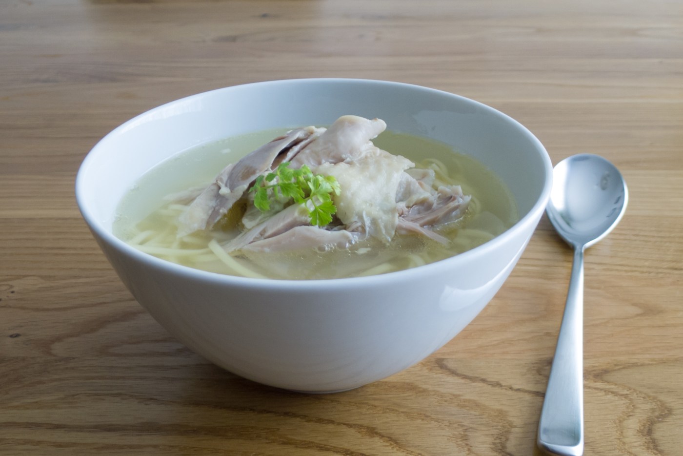Die Hühnersuppe steht und fällt mit der Brühe. Ich habe über Jahre hinweg Verschiedenes probiert, getestet, gekostet. Es gibt fertige Brühen in Gläsern zu kaufen, zum Teil sogar in Bioqualität. Die haben zum einen meist einen stolzen Preis und sind zum anderen leider mit zu vielen verschiedenen Gewürzen und Zutaten versetzt. Mein Resümee: es kommt nichts an die selbstgekochte Brühe heran. Wer jetzt denkt, Brühe aus einem echten Huhn selbst zu kochen sei nur etwas für Großfamilien, irrt – sie lässt sich gerade für den Kleinsthaushalt gut auf Vorrat kochen und portionsweise einfrieren, so dass sich der Aufwand wirklich lohnt. Mehr dazu bald in einem eigenen Blogbeitrag. Heute geht es um die Suppe.