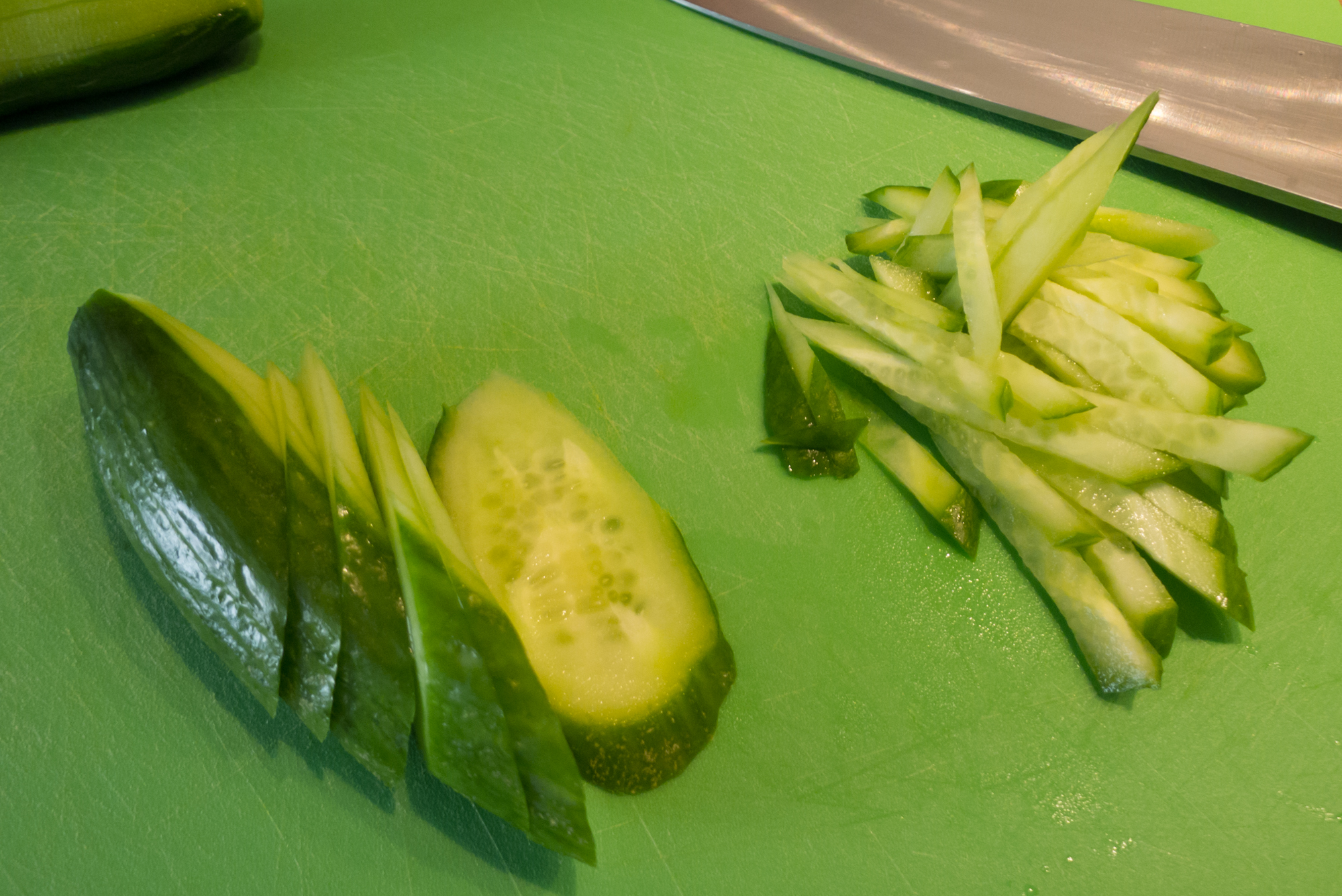 In der Zwischenzeit Gurke(n) waschen und zur Hälfte schälen. Karotten schälen. Beides in Stifte schneiden (Julienne). Dafür am besten zunächst schräge Scheiben und dann daraus Stifte schneiden: so werden die Stifte schön lang, sind aber einfacher zu schneiden, als wenn das Gemüse zunächst in Längsscheiben geschnitten wird.