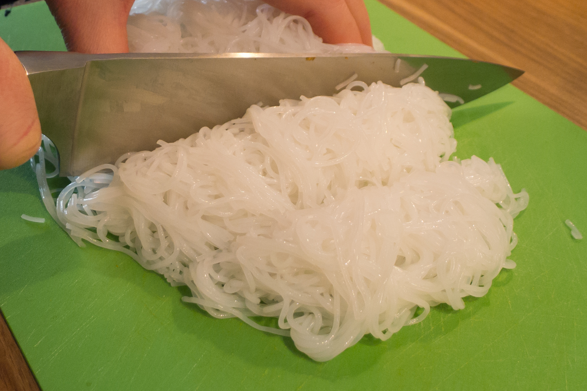 Glasnudeln mit kochendem Wasser übergießen und abgedeckt gar ziehen lassen (es dauert etwa 10 Minuten).