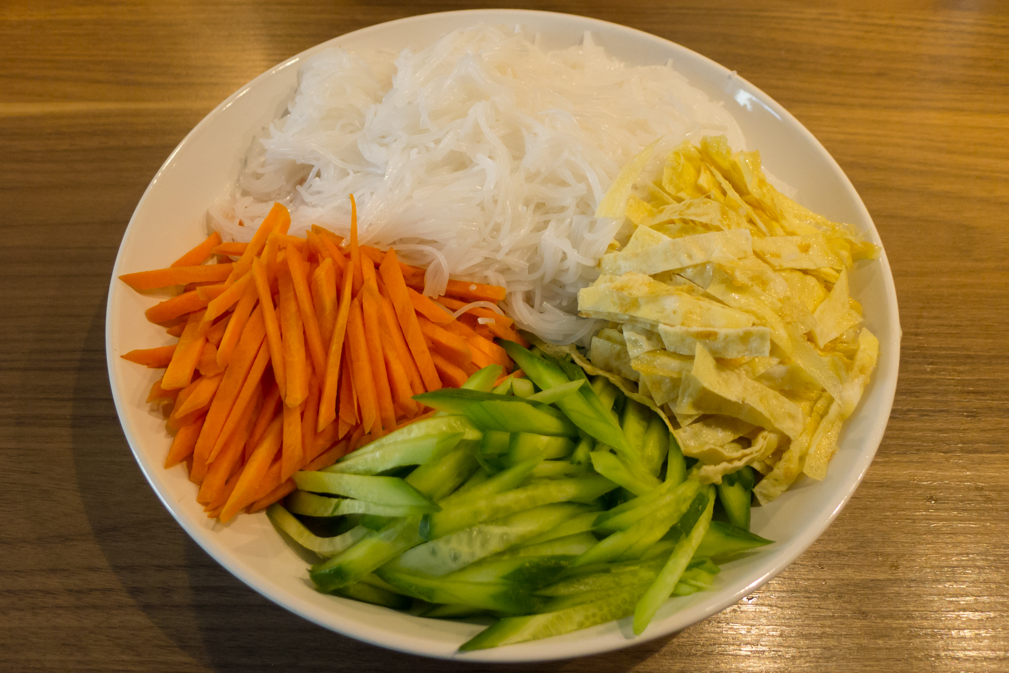 Mit dem Rest der Eiermasse gleich verfahren. Wenn die Pfanne trocken werden sollte ggf. erneut etwas Öl hineingeben. Die Omelette abkühlen lassen und in Streifen schneiden. Die gut abgetropften Nudeln kleinschneiden.