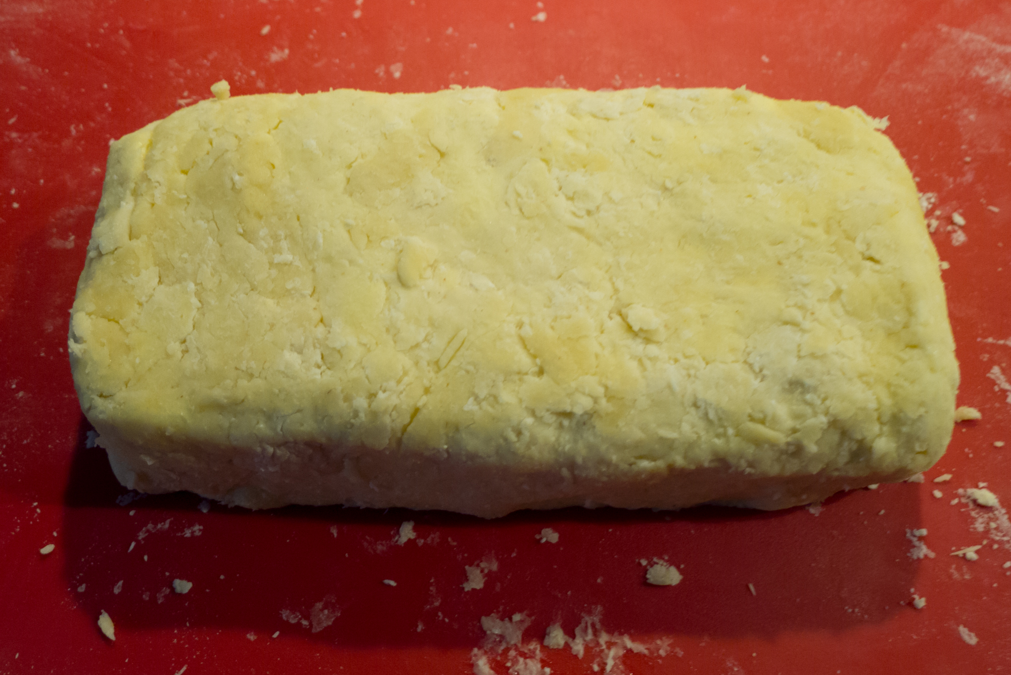 Das Ganze kurz miteinander vermengen bis es gerade so zusammenhält, auf keinen Fall kneten. Den Teig zu einem Quader formen und in einem Beutel für mindestens 2 Stunden in den Kühlschrank geben. Laut Babuschka Emma von videoculinary.ru ist eine Kühlzeit von 10 Stunden noch besser und der Teig kann wohl auch mehrere Tage im Kühlschrank aufbewahrt oder auch für Monate eingefroren werden.