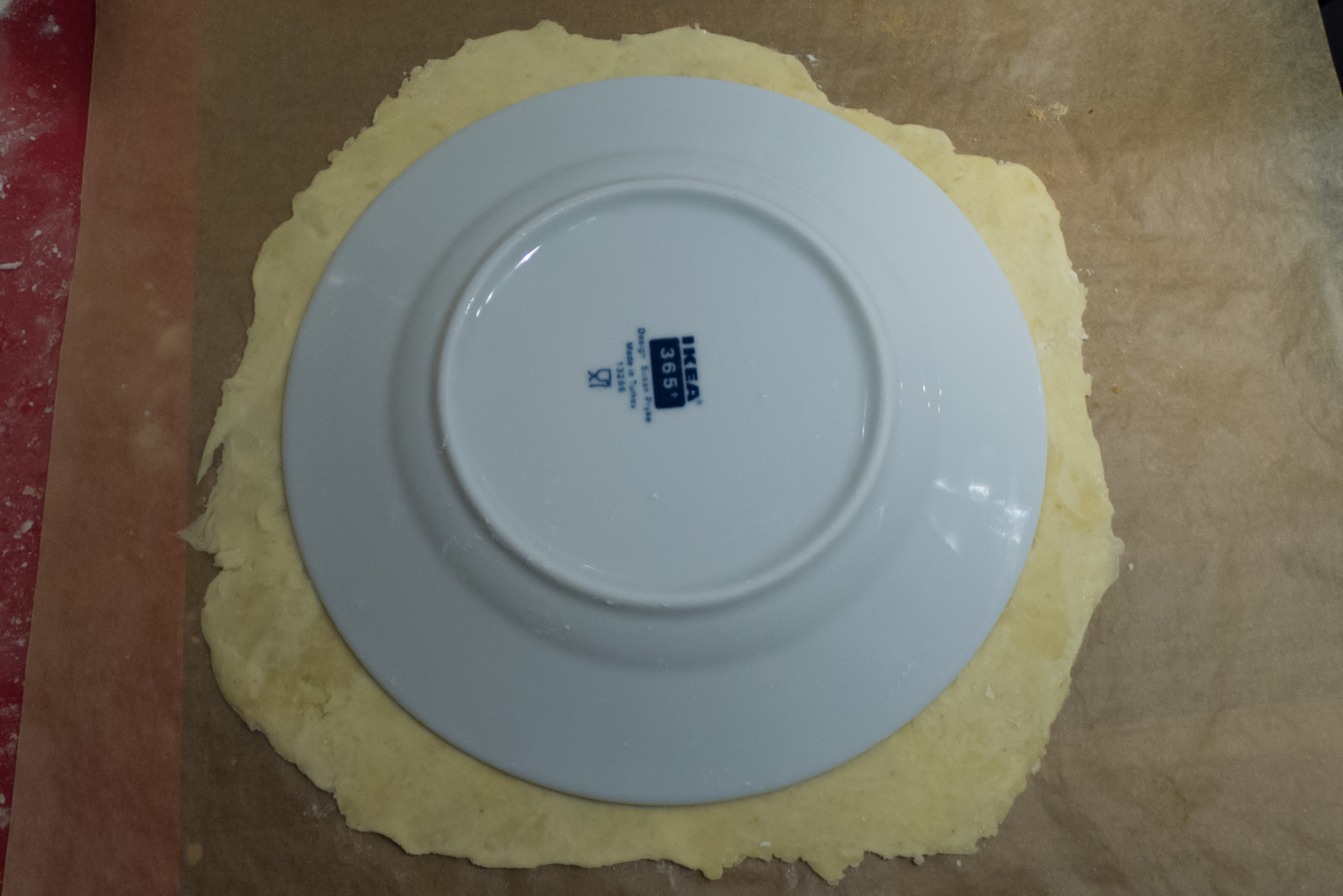 Teig/Backen: Den Backofen auf ca. 220° Ober-/Unterhitze aufheizen. Es wird eine Schablone von etwa 20 cm Durchmesser benötigt, z.B. ein Dessert-/Frühstücksteller. Den Teig in 4-6 etwa gleich große Stücke teilen. Die noch nicht gebrauchten Stücke dabei weiterhin im Külschrank aufbewahren. Ein Teigstück aus dem Kühlschrank nehmen und auf einer bemehlten Arbeitsfläche oder direkt auf Backpapier so groß ausrollen, dass es gerade die Schablone/den Teller überragt. Damit die Böden ihre Form behalten, am besten direkt auf dem Backpapier entlang des Tellers rund schneiden und nicht mehr bewegen.
