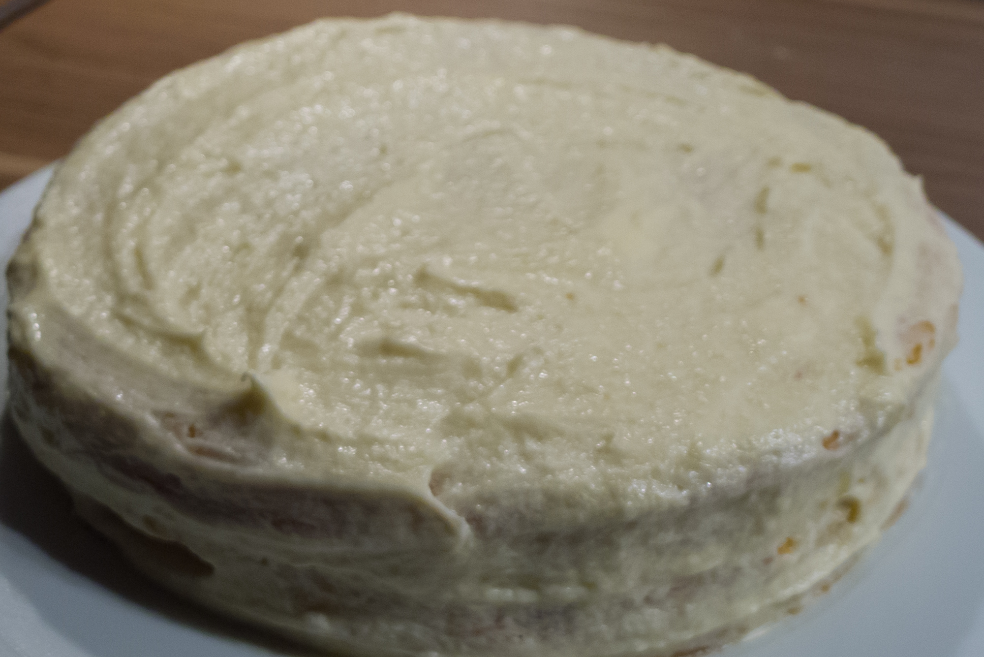 Den nächsten Boden darauf geben und wieder mit Creme bestreichen. So verfahren bis alle Böden aufgebracht sind. Nun die Torte rundherum mit Creme bestreichen.