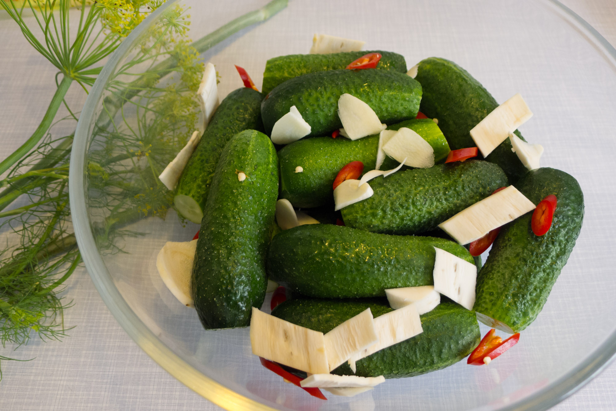 „Malosolnyje“ heißt wörtlich übesetzt eigentlich „wenig gesalzen“, das sollte aber eher im Sinne von „kurz“ als im Sinne von „sparsam“ verstanden werden. Wer diese Gurken weiter fermentieren lässt, erhält ganz wunderbare Salzgurken. Nach nur 1 Tag sind die Gurken „kurz gesalzen“ und ergeben eine frische Beilage, die auch anstelle eines Salates gereicht werden kann.