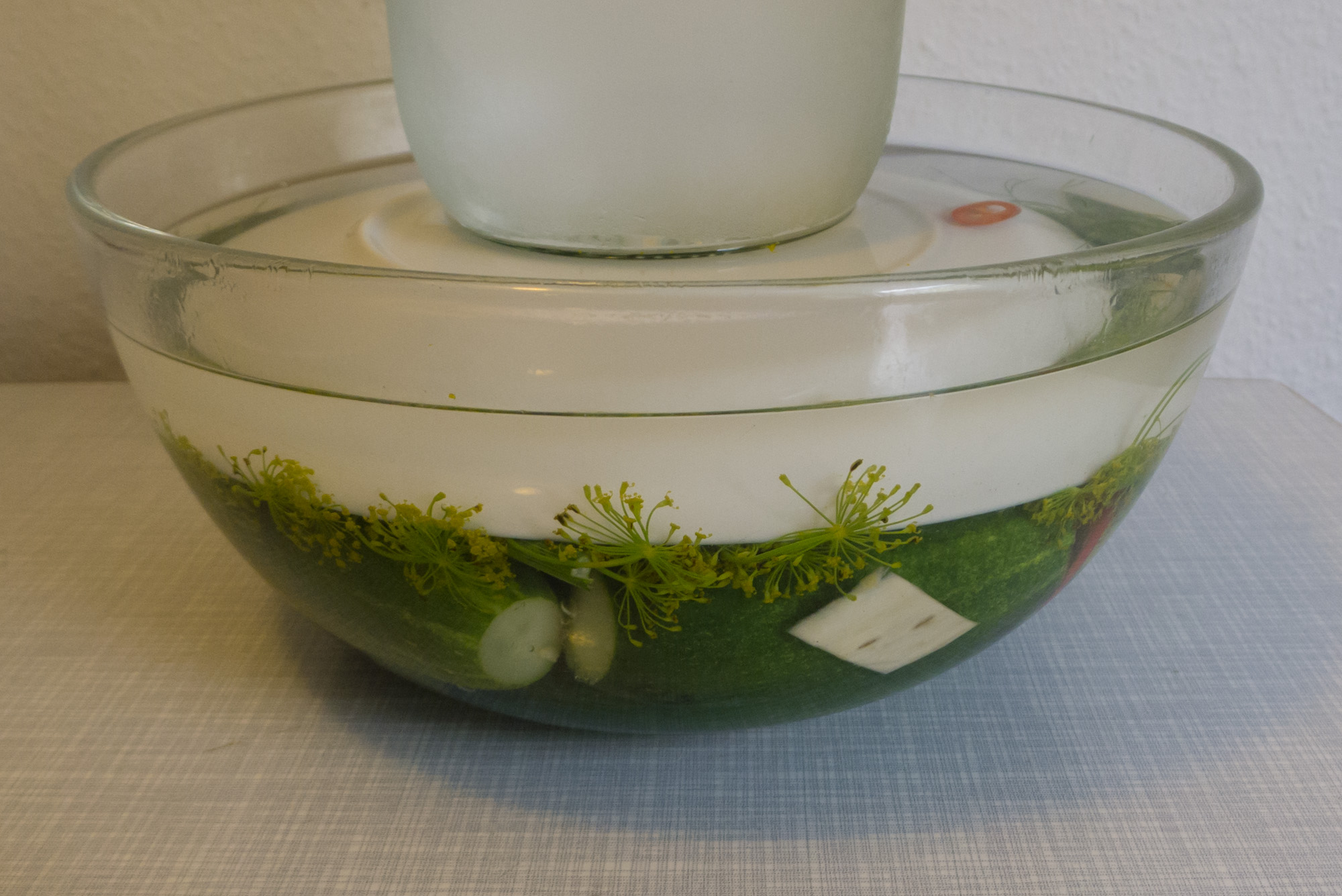 Nun die Gurken mit einem Teller und einem großen sauberen Stein oder z.B. einem mit Wasser gefüllten Glas beschweren. Mindestens über Nacht bei Zimmertemperatur ziehen lassen, dann längs vierteln und z.B. zu Bratkartoffeln oder zu Gegrilltem servieren.