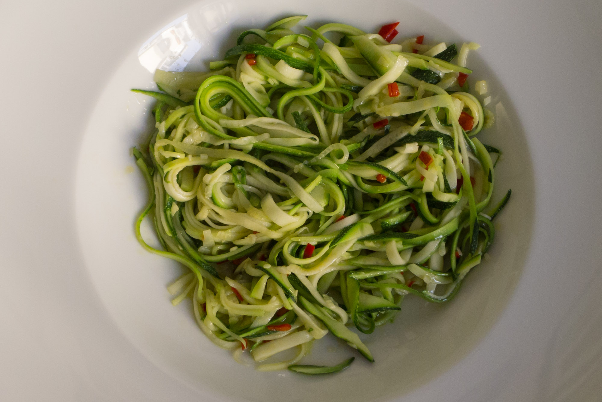 Diese Zucchinispaghetti sind ein leichtes Gericht für einen heißen Sommerabend, das schnell geht, nicht schwer im Magen liegt und dabei wunderbar köstlich ist.
