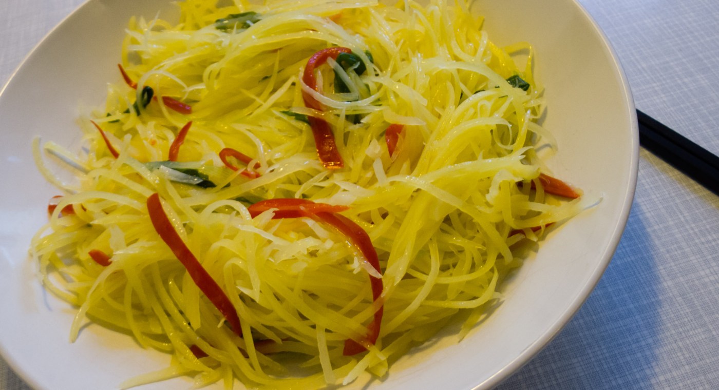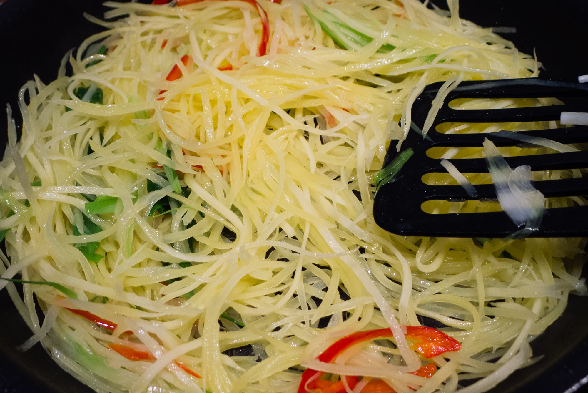 Ja, es ist möglich Kartoffeln als pfannengerührtes Gericht zuzubereiten. Im Norden Chinas, woher dieses Gericht stammt, wird es 酸辣土豆絲 (suan la tu dou si) genannt, was wörtlich übersetzt etwa sauerscharfe Kartoffelstifte heißt.