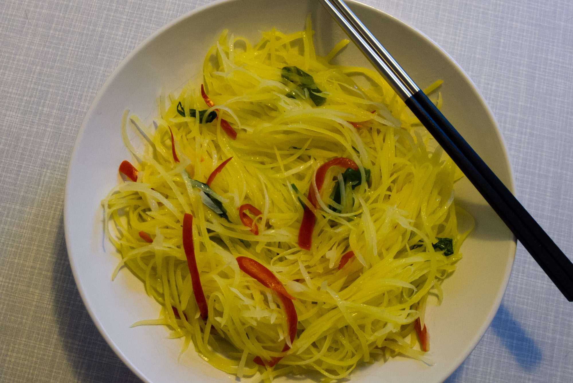Erstmalig aufgefallen ist mir dieses Gericht durch ein Video von Strictly Dumpling. Ich war so neugierig, dass ich es ausprobieren musste. Dabei habe ich Kleinigkeiten abgewandelt, mich aber im Großen an seine Vorgaben gehalten. Ich war sehr überrascht. Bisher kannte ich kein Kartoffelgericht, das ich als „erfrischend“ hätte bezeichnen können oder wollen: dieses ist es. Seid gewarnt: dieses Gericht schmeckt überhaupt nicht nach Kartoffeln. Die Kartoffeln sind knackig und knusprig ohne roh (oder totfrittiert) zu sein.