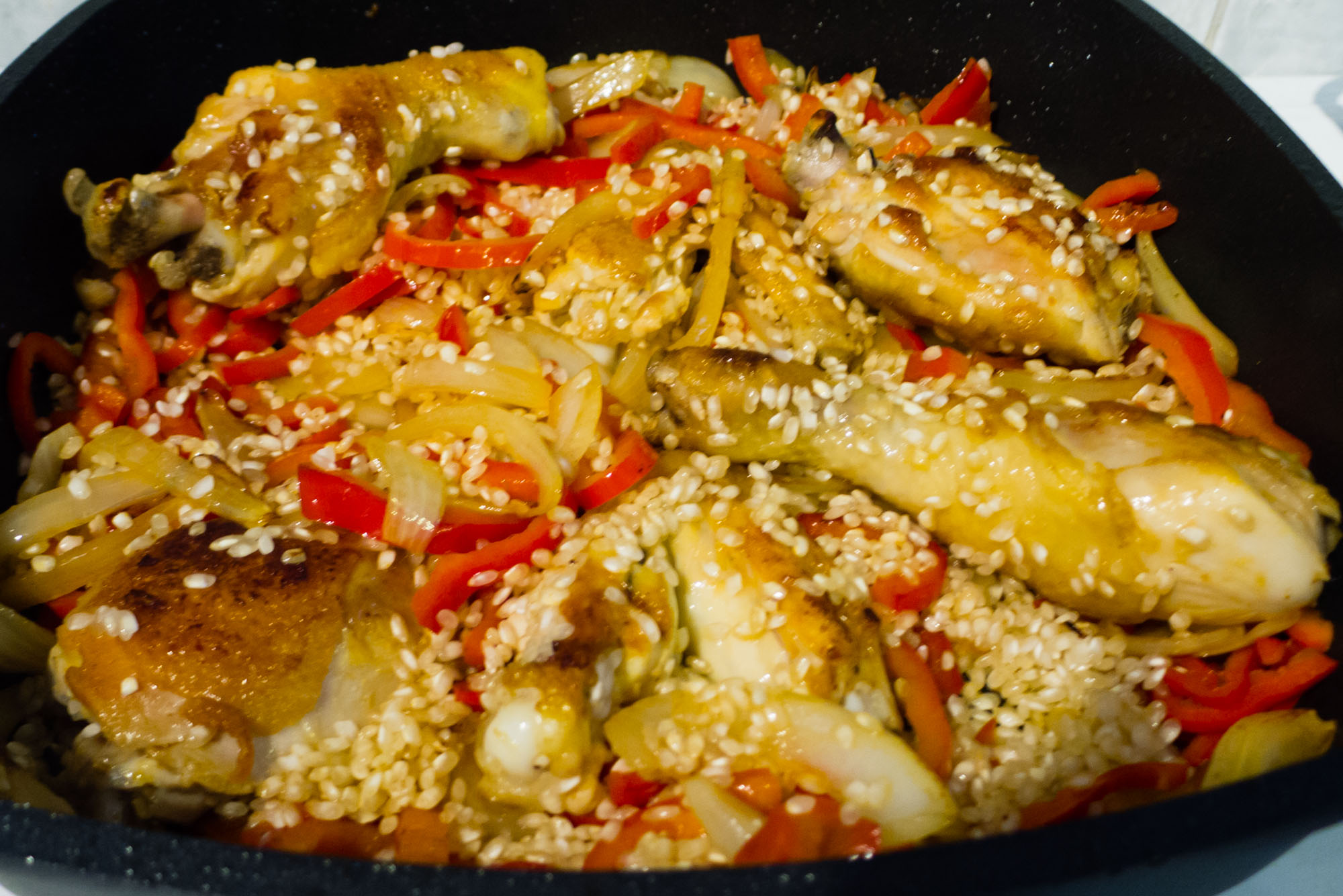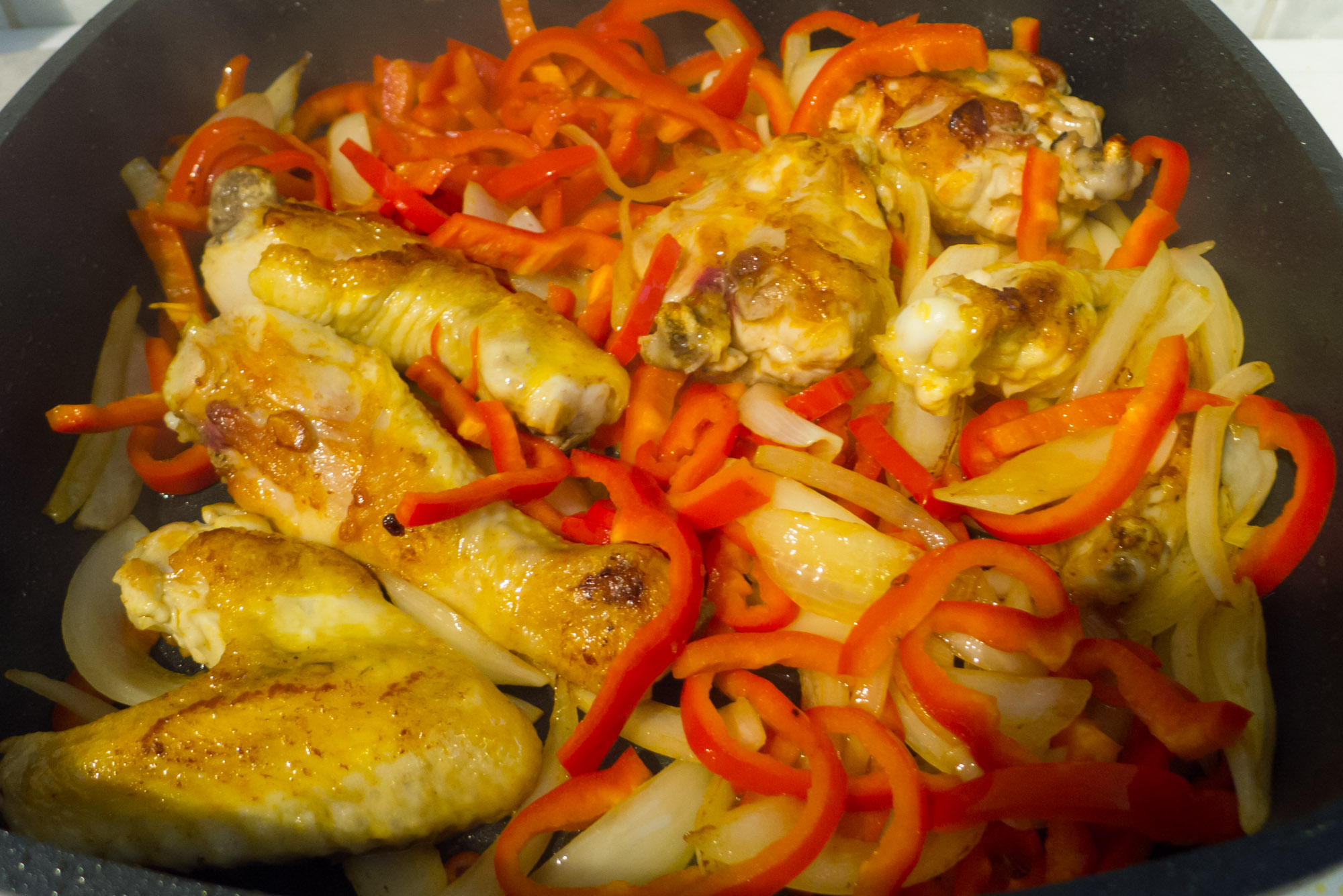 Dann Zwiebel- und Paprikastreifen hinzufügen und mitbraten bis beides etwas Farbe annimmt.