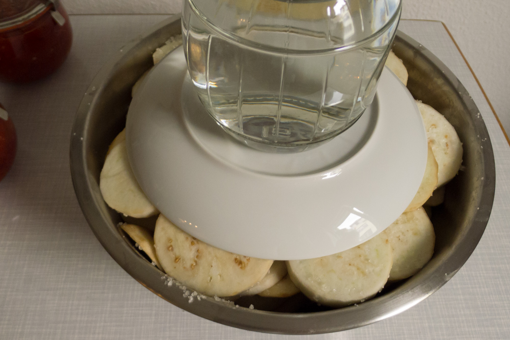 Nach 24 Stunden werden die Auberginen deutlich an Volumen verloren und viel Flüssigkeit von sich gegeben haben: