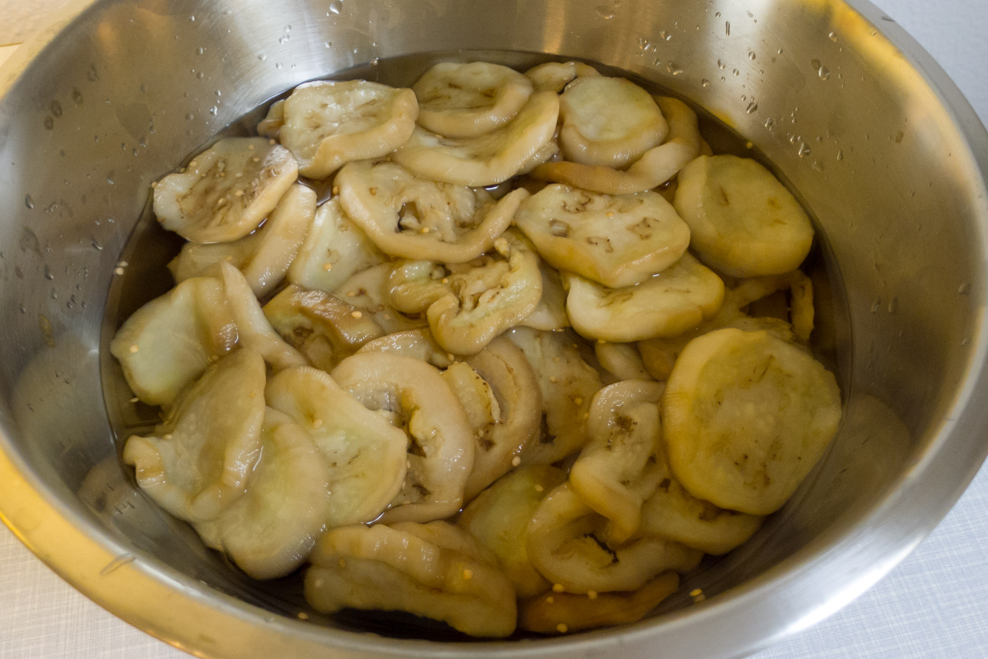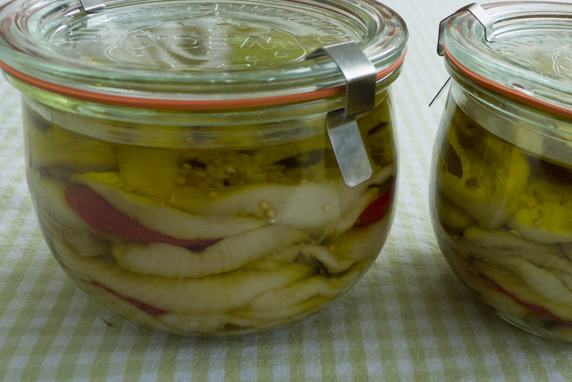 Momentan ist Auberginensaison und es gab in den letzten Wochen eine große Auswahl lokaler Auberginen auf unserem Markt, so dass ich wieder einen kleinen Vorrat angelegt habe, diesmal in kleineren Gläsern.