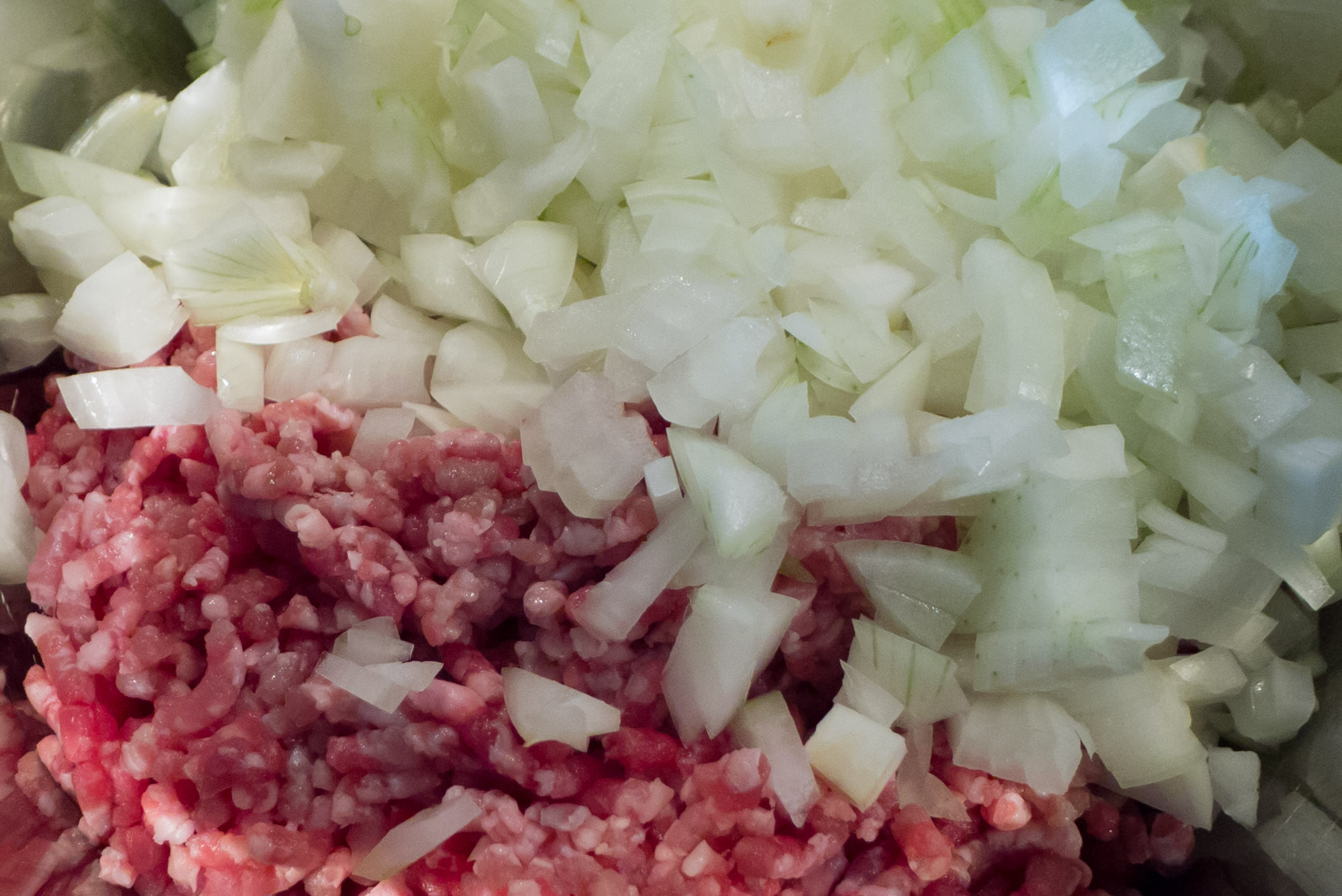 In der Zwischenzeit die Zwiebeln schälen und schneiden, die Zwiebelstücke dürfen dabei gerne etwas gröber als das Hackfleisch sein. Die Zwiebelstücke und das Fleisch müssen in etwa das gleiche Volumen aufweisen.