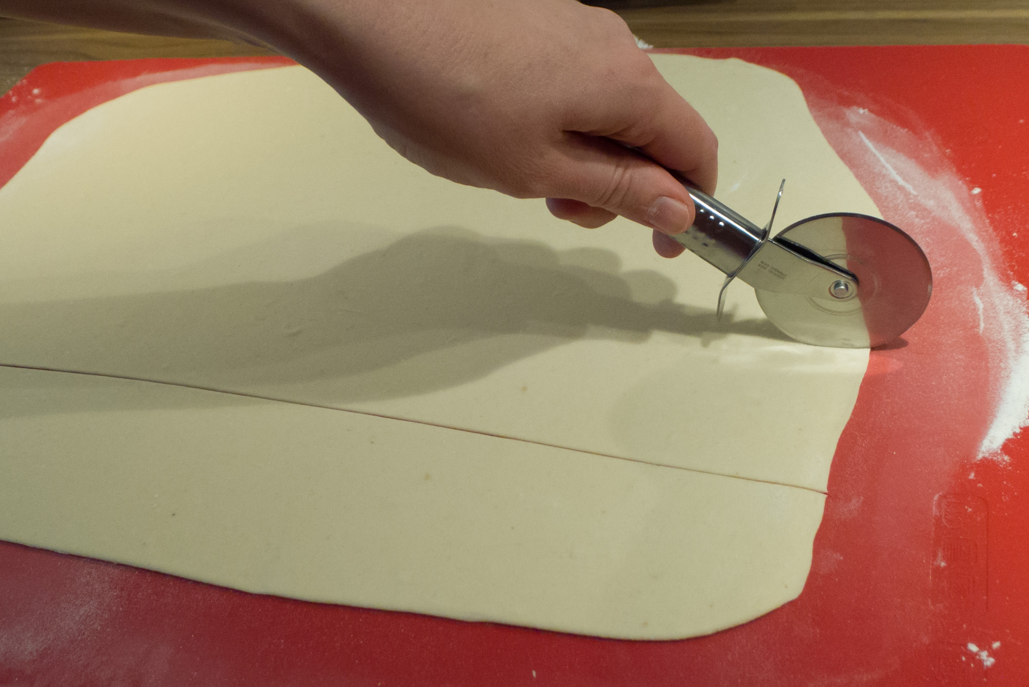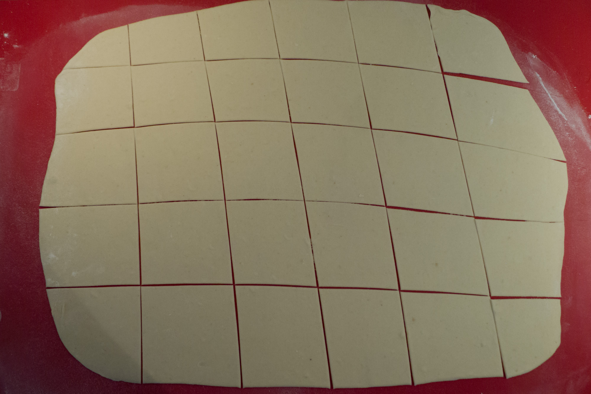 Nun den Teig halbieren. Eine Hälfte erneut abdecken, die andere auf einer leicht bemehlten Unterlage dünn ausrollen. Den Teig mit Hilfe eines Messers oder eines Pizzarollers in Quadrate von etwa 8-10 cm schneiden.