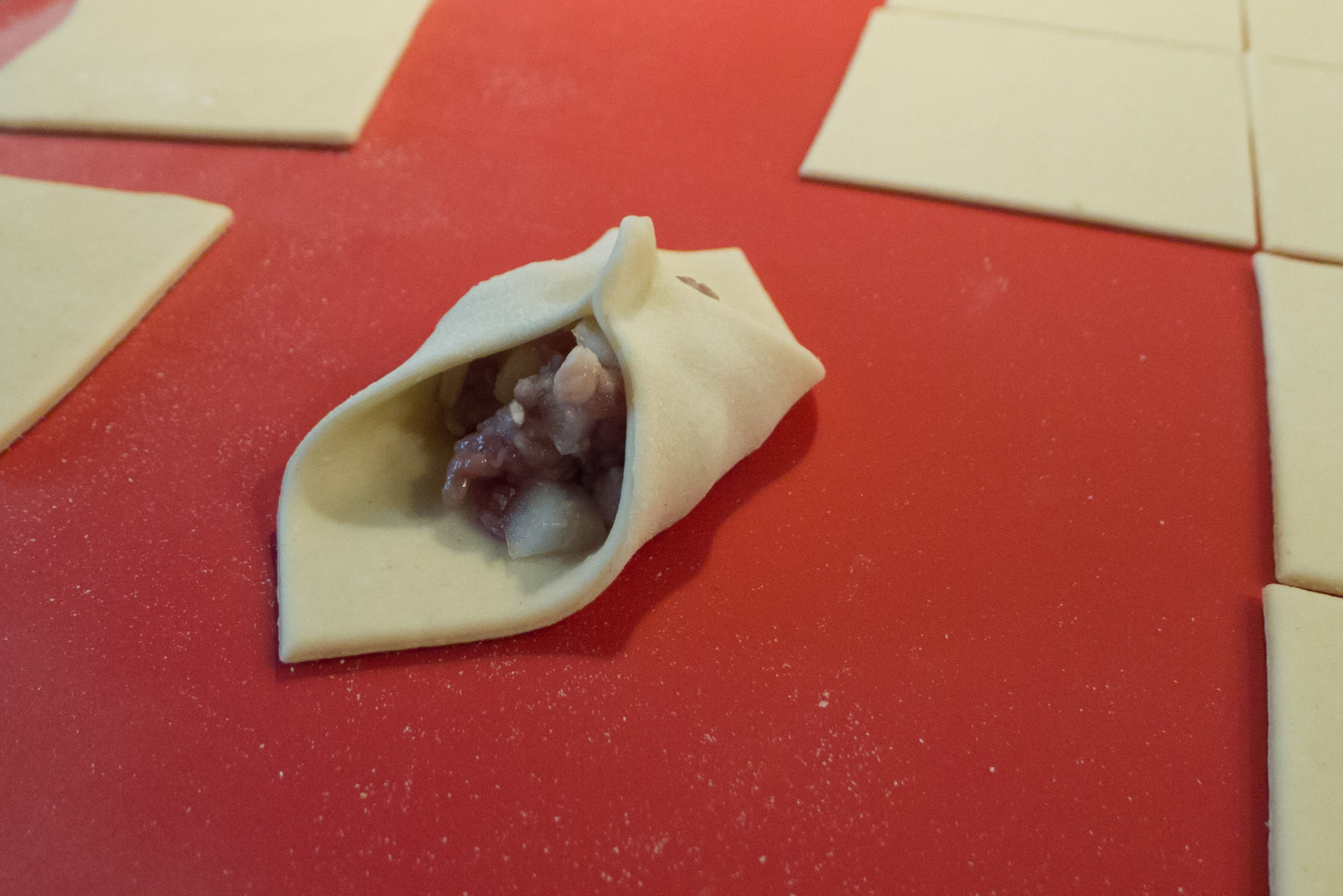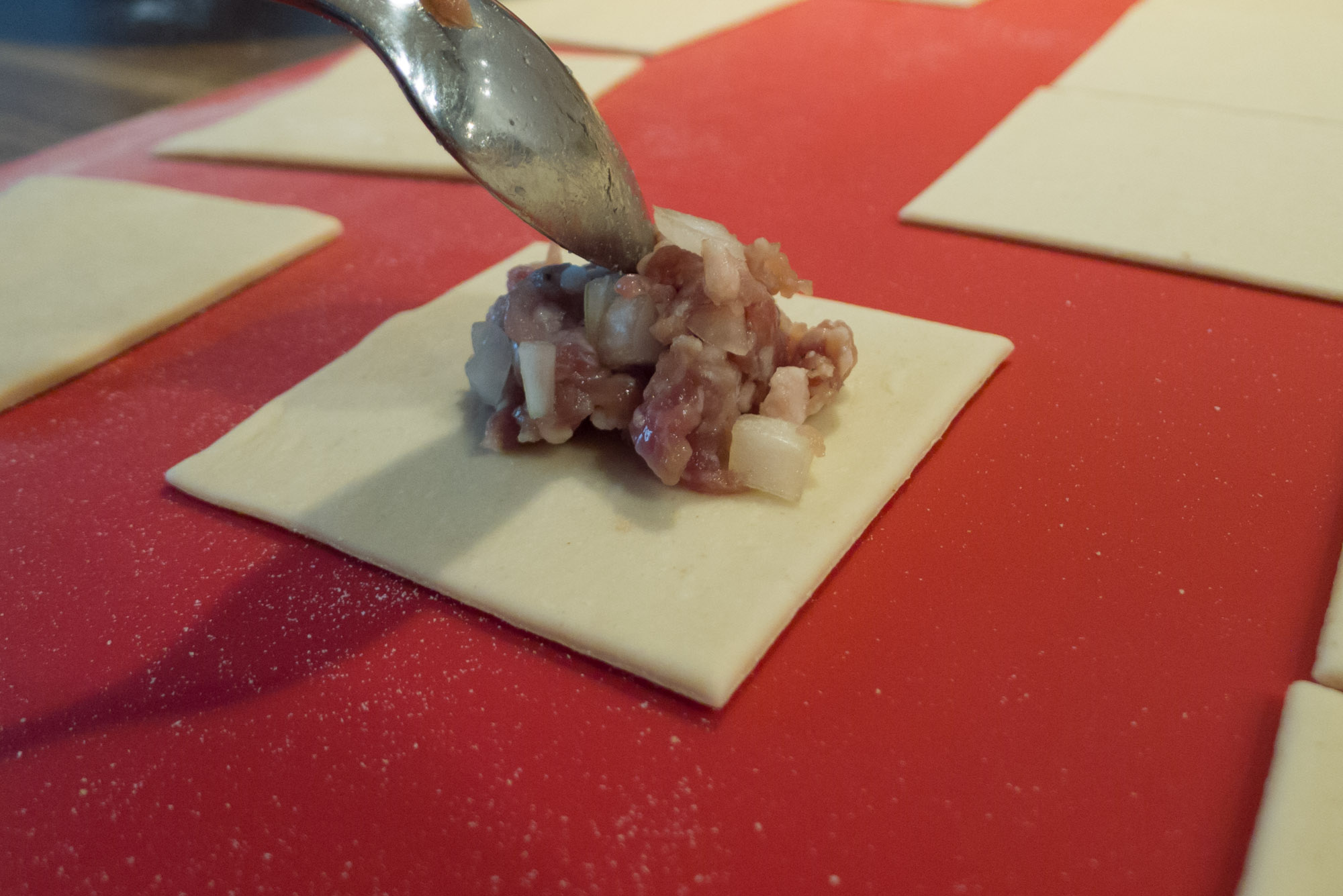 Auf jedes Teigstück (je nach Größe) ca. 1 EL Füllung geben, dabei die Teigränder frei lassen und möglichst nicht mit der Füllung berühren.