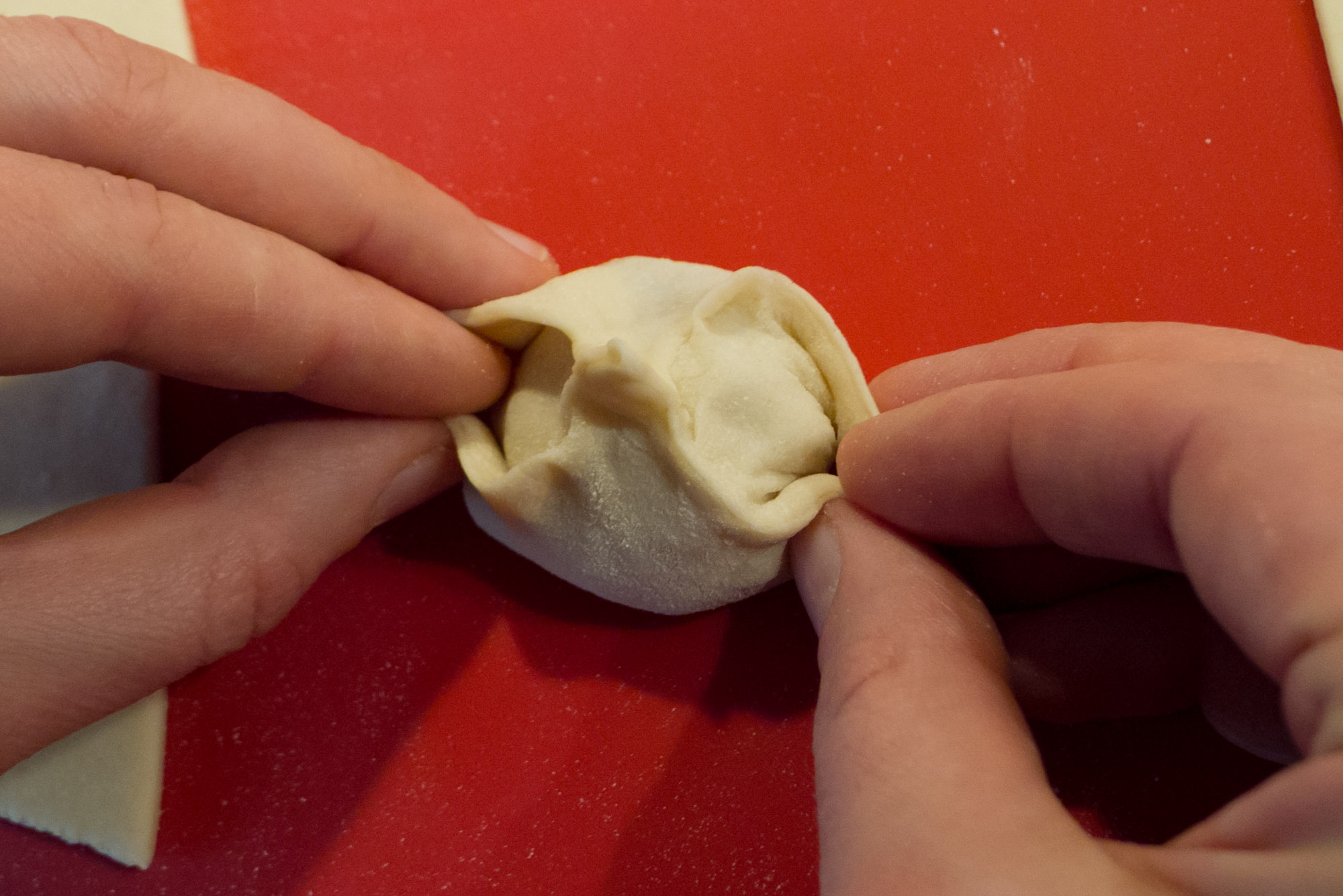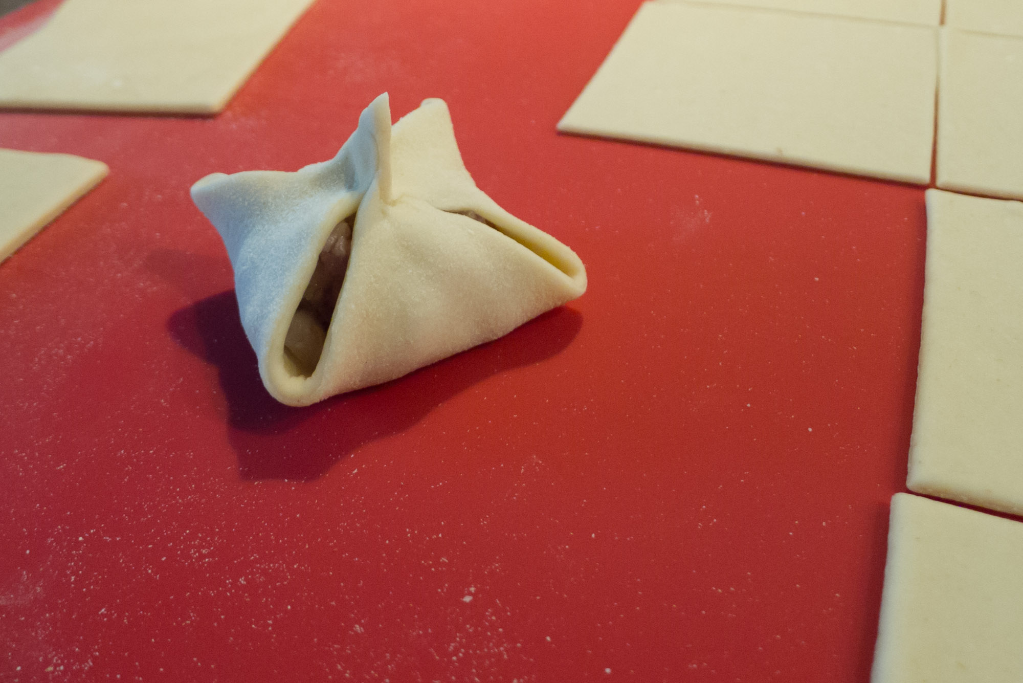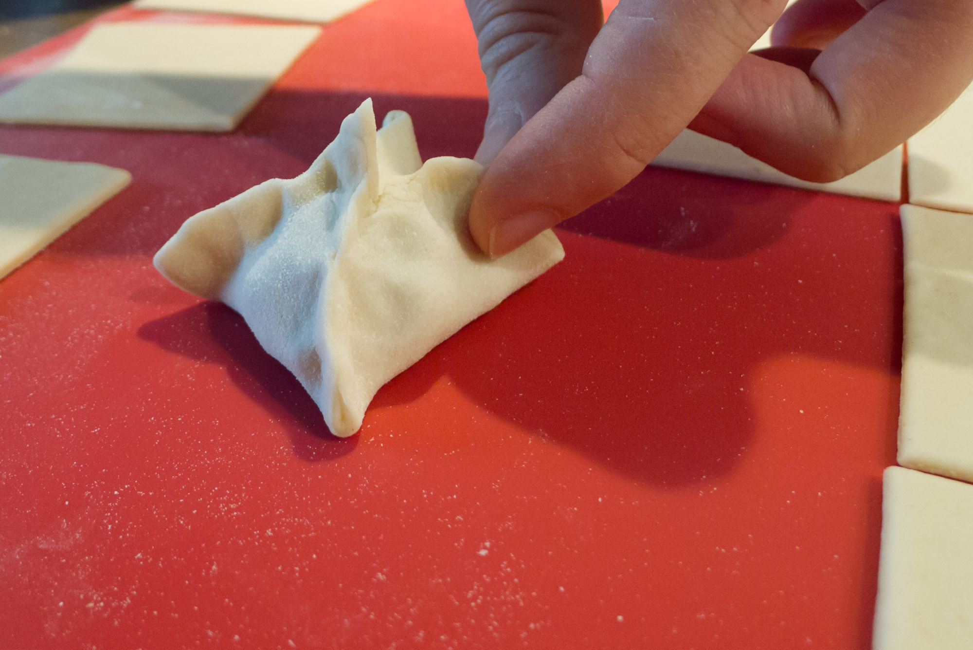 Zwei gegenüberliegende Teigecken miteinender verkleben.