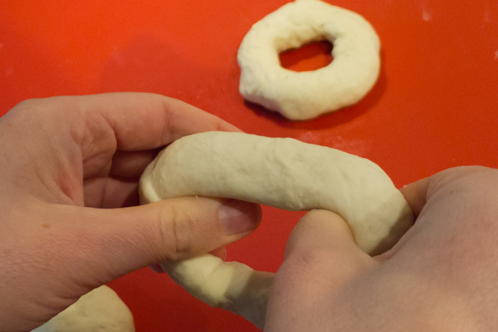Nun gibt es zwei Möglichkeiten weiter zu verfahren: entweder den Teig als ganzes mindestens über Nacht (bis zu 2 Tage) zum Gehen in den Kühlschrank stellen und am Backtag formen, oder bereits jetzt zu Bageln formen und sie dann in den Kühlschrank geben. Die zweite Möglichkeit bedeutet zwar etwas weniger Arbeit am Backtag, allerdings braucht man dafür Platz für ein Blech im Kühlschrank.