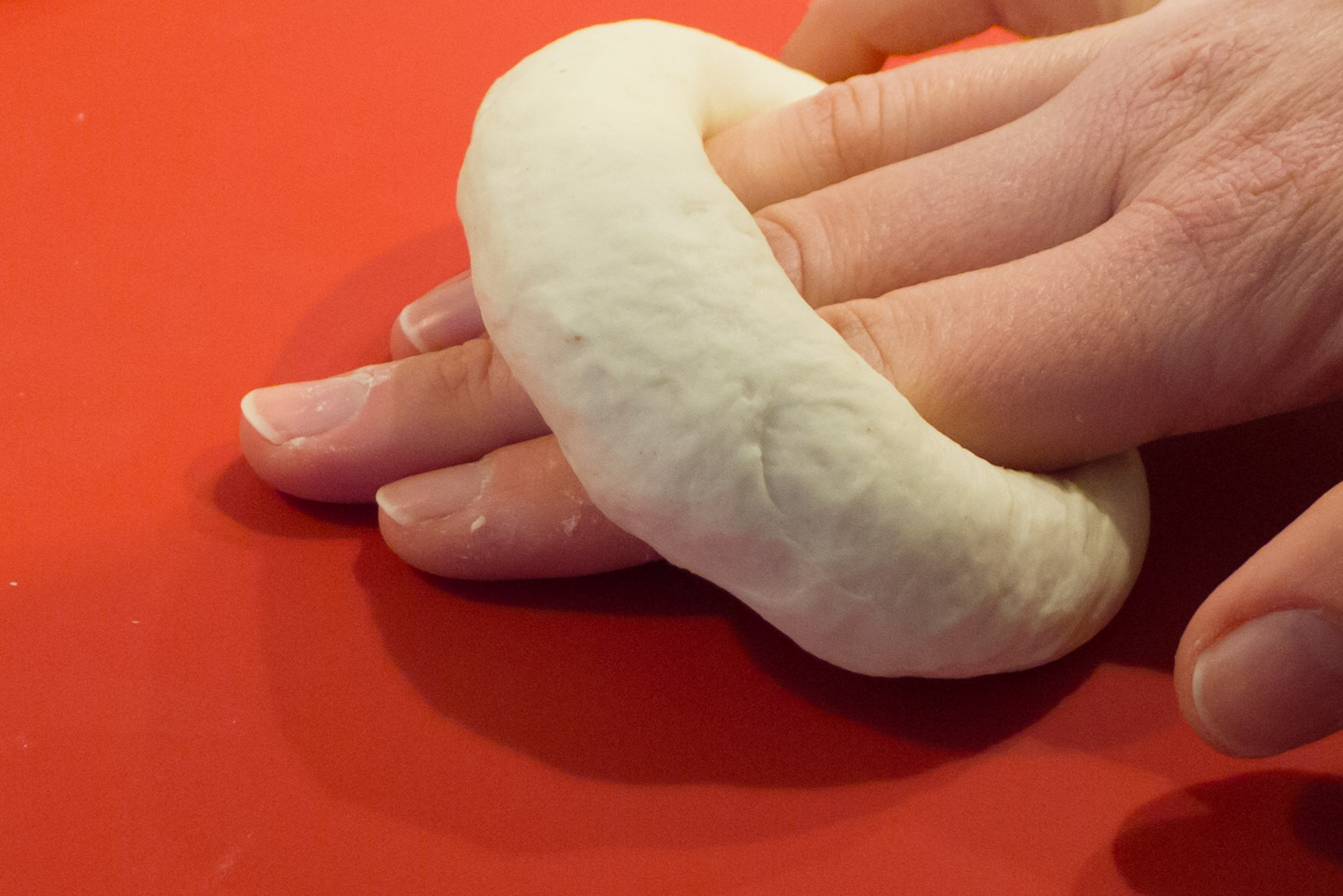 Den Teig auf eine trockene Unterlage geben (nicht bemehlt), kurz verkneten und in 6-8 gleich große Stücke teilen (das funktioniert am Besten mit Hilfe einer Küchenwaage). Jedes einzelne Teigstück zu einer Kugel formen.