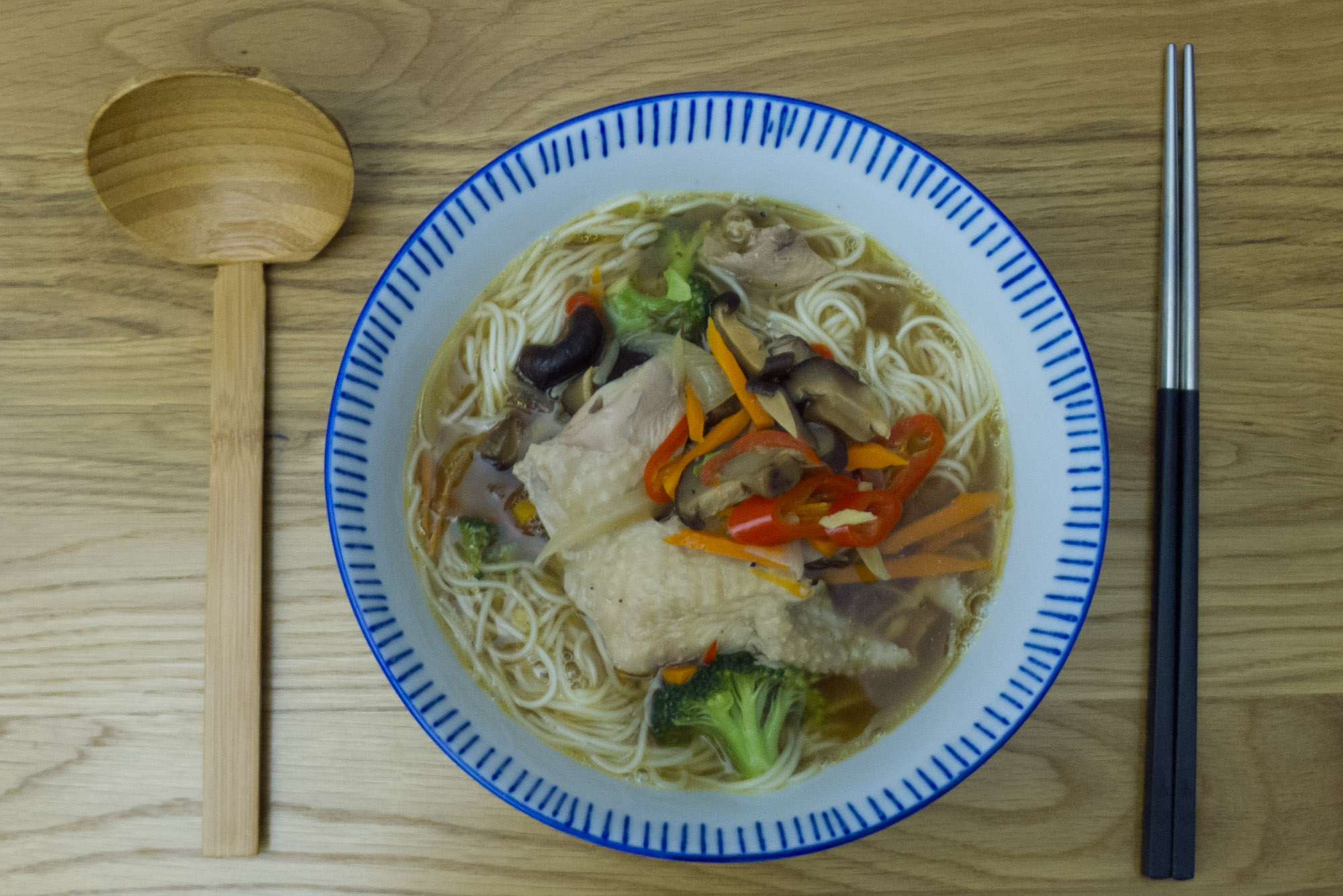 Ich habe immer wenigstens 2 Gemüsesorten und wenigstens 1-2 scharfe Komponenten in dieser Suppe. Heute hatte ich Glück Sichuan-Pfeffer, Chilies, Ingwer, Knoblauch und schwarzer Pfeffer in meinen Vorräten vorzufinden, so dass meine heutige Suppe eine sehr komplexe Schärfe aufwies, die alle Sinne anspricht ohne einem den Mund zu verbrennen. Frühlingszwiebeln und frische Pilze hatte ich heute keine – ansonsten füge ich beides sehr gerne der Suppe hinzu. Ich ergänze die Suppe auch gerne mit Hähnchenfleisch. Was die Nudeln betrifft, habe ich bereits viele asiatische Suppennudeln ausprobiert, mir schmecken vor allem Weizen- und Buchweizennudeln darin.