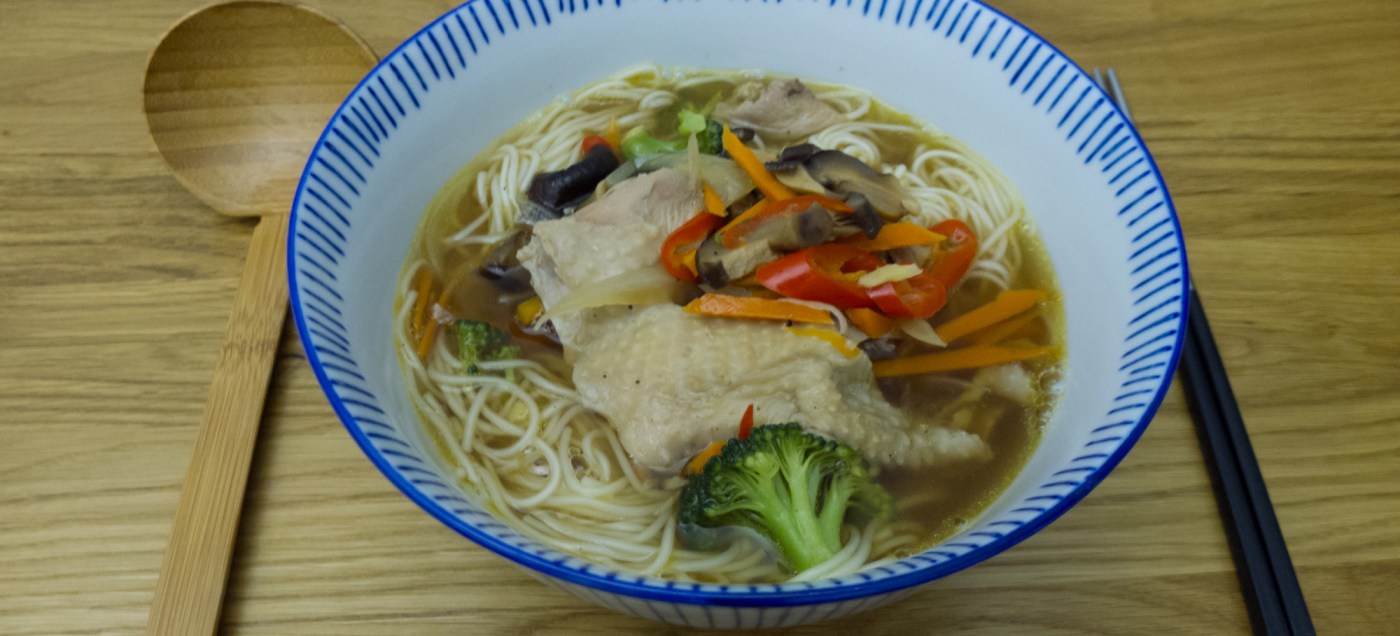 Den Hähnchenschlegel (oder sonstige Hähnchenbestandteile) in Brühe gar kochen. Wenn getrocknete Pilze verwendet werden, diese für etwa 1 Stunde in heißem Wasser einweichen, dann ausdrücken und in Streifen schneiden. Die Karotte und die Zwiebel schälen und in feine Streifen schneiden. Knoblauch und Ingwer schälen und jeweils fein würfeln oder stifteln. Die Chili ggf. entkernen und in Ringe schneiden.