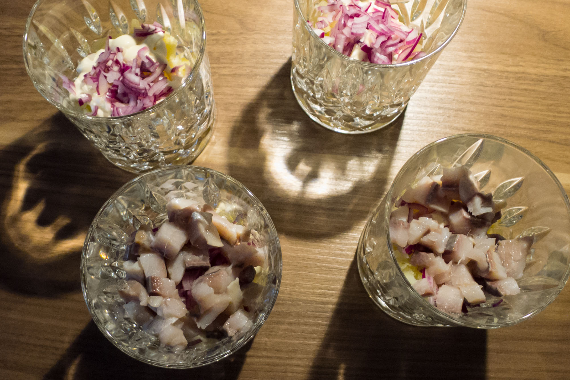 Dann die Zwiebeln, den Hering und wieder je etwa 1 EL Mayonnaise.