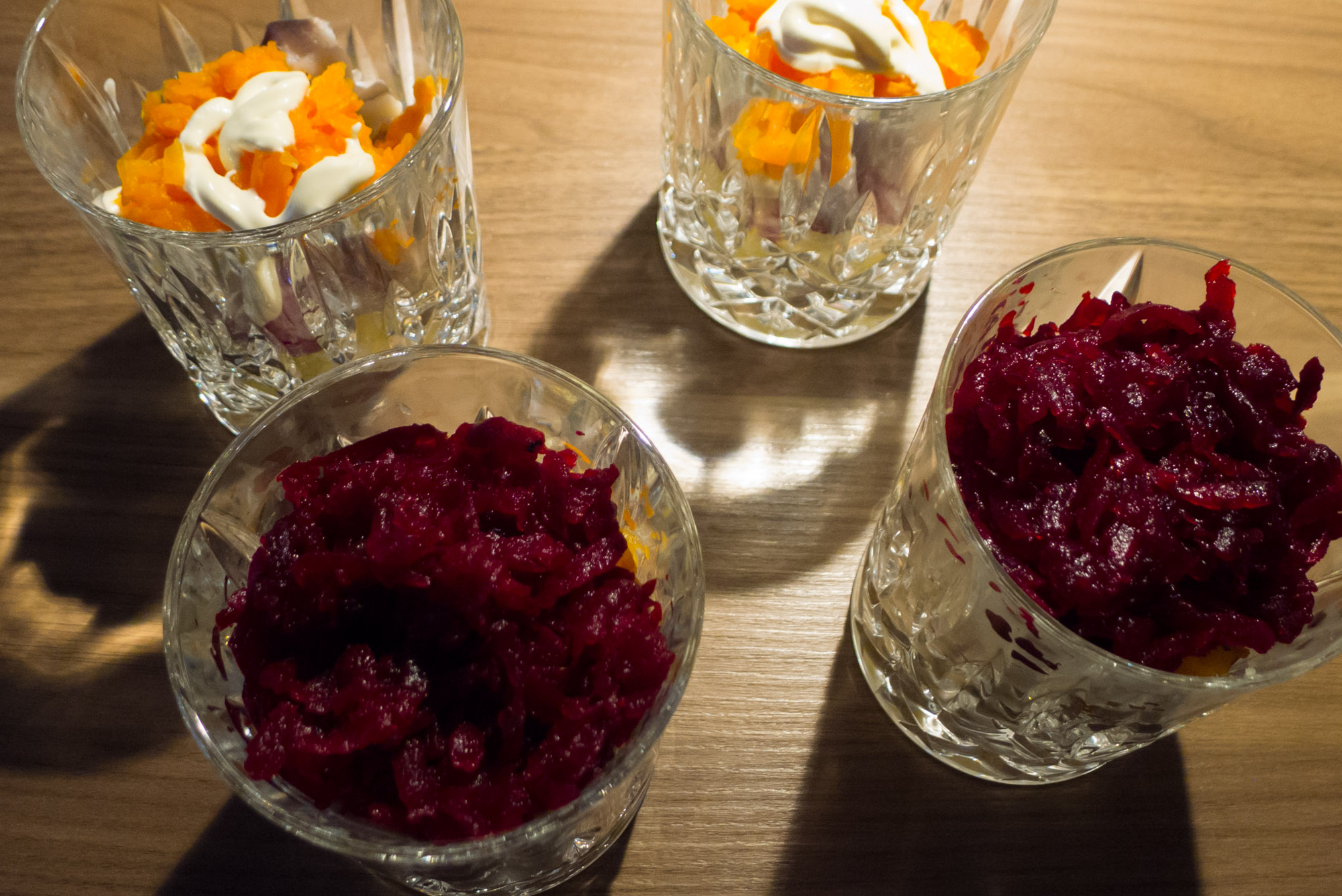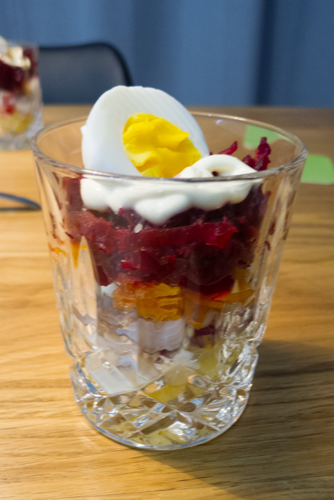 Die Karotten und je 1 TL Mayonnaise. Zum Schluss die rote Beete.
