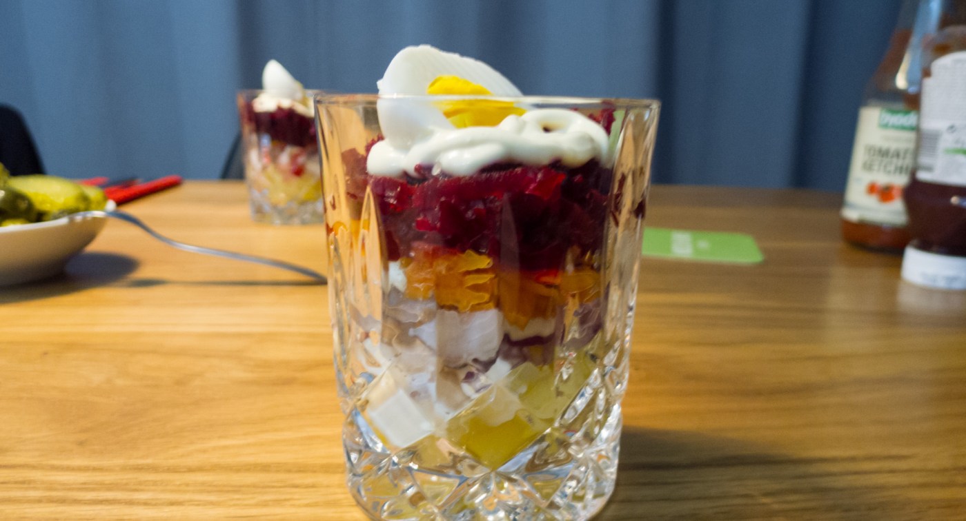 Dieser russische Schichtsalat wird nahezu bei jedem Fest gereicht, er darf vor allem Silvester nicht fehlen. In größeren Gesellschaften wird er normalerweise auf einer großen Platte angerichtet und kunstvoll verziert.