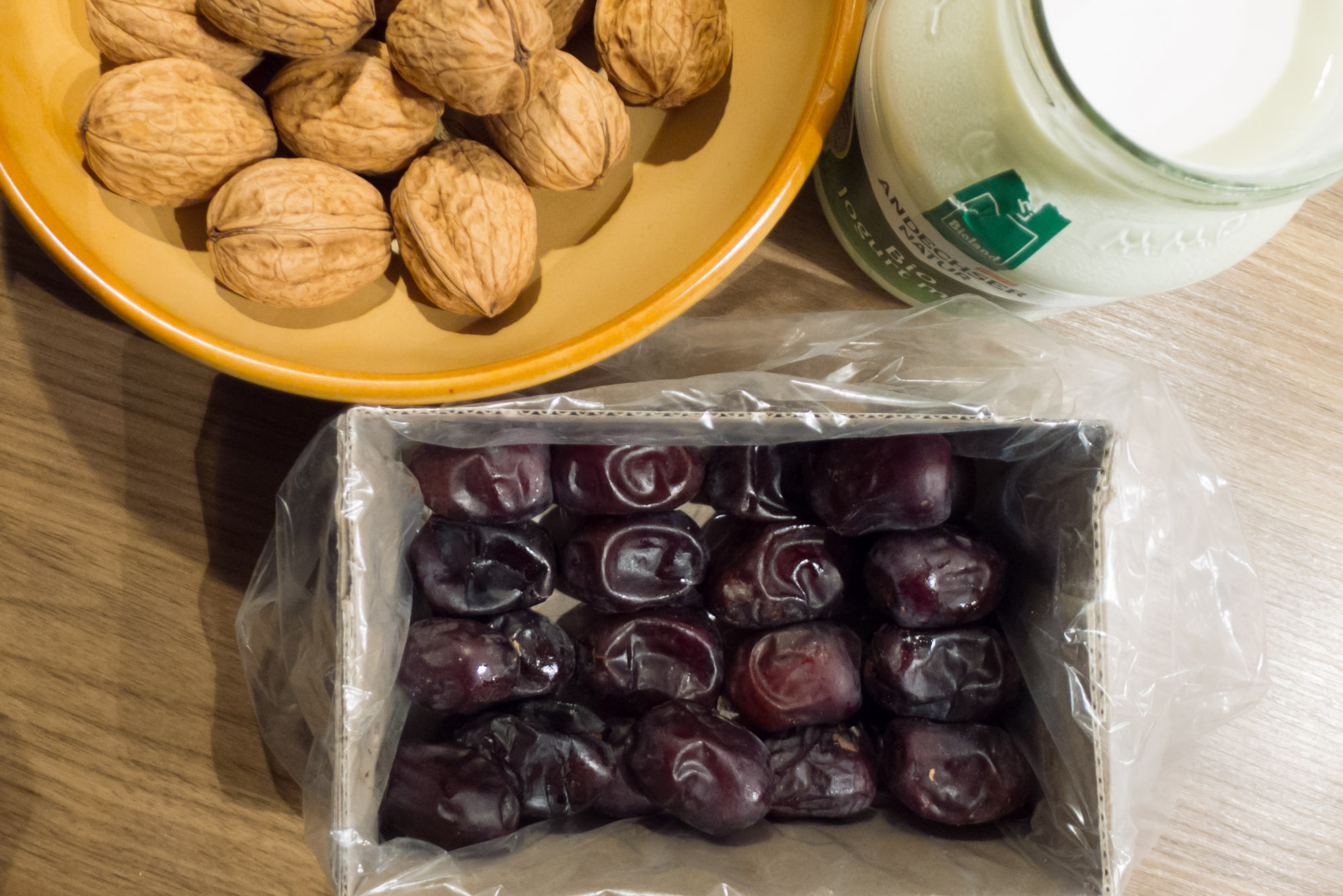 In einem Kochkurs zur persischen Küche wurden mir die Augen geöffnet: Datteln sind nicht gleich Datteln. Ich probierte das erste Mal frische Datteln aus dem Iran und war hin und weg. Sie waren wunderbar weich und schmeckten weniger süß als befürchtet. Die Kombination aus Datteln, Nüssen und Naturjoghurt ergibt einen sehr einfachen und dabei erstaunlich leckeren Nachtsich.