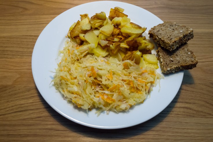 In meiner Kindheit wurde hierfür selbstgemachtes Sauerkraut verwendet, das immer etwas Karotten enthielt. In Ermangelung eines solchen greife ich auf gutes offenes Pfälzer Sauerkraut zurück – glücklicherweise gibt es bei uns einen Marktstand, der welches verkauft – und füge die Karotten frisch hinzu.