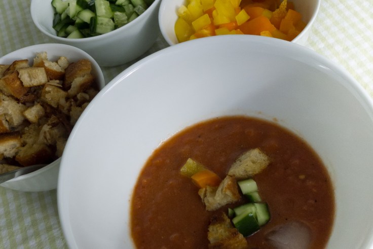 Die momentan vorherrschenden Außentemperaturen wecken den Hunger nach kalt sevierten Gerichten. Die Sonne trägt aber auch dazu bei, dass auf dem Markt gerade richtig reife Tomaten aus dem Umgebung verkauft werden. Beste Voraussetzungen für eine Gazpacho.