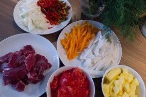 Das Fleisch in mundgerechte Stücke schneiden. Karotten, Daikon, Zwiebeln und Paprika jeweils in Streifen. Die Chili-Schote ggf. entkernen, in Streifen oder Ringe schneiden und zur Paprika geben. Die Kartoffel würfeln. Tomaten in kleine Stücke schneiden (außerhalb der Tomatensaison lieber Dosentomaten verwenden). Dill und Petersilie waschen, trocken schütteln und jeweils fein wiegen.