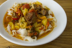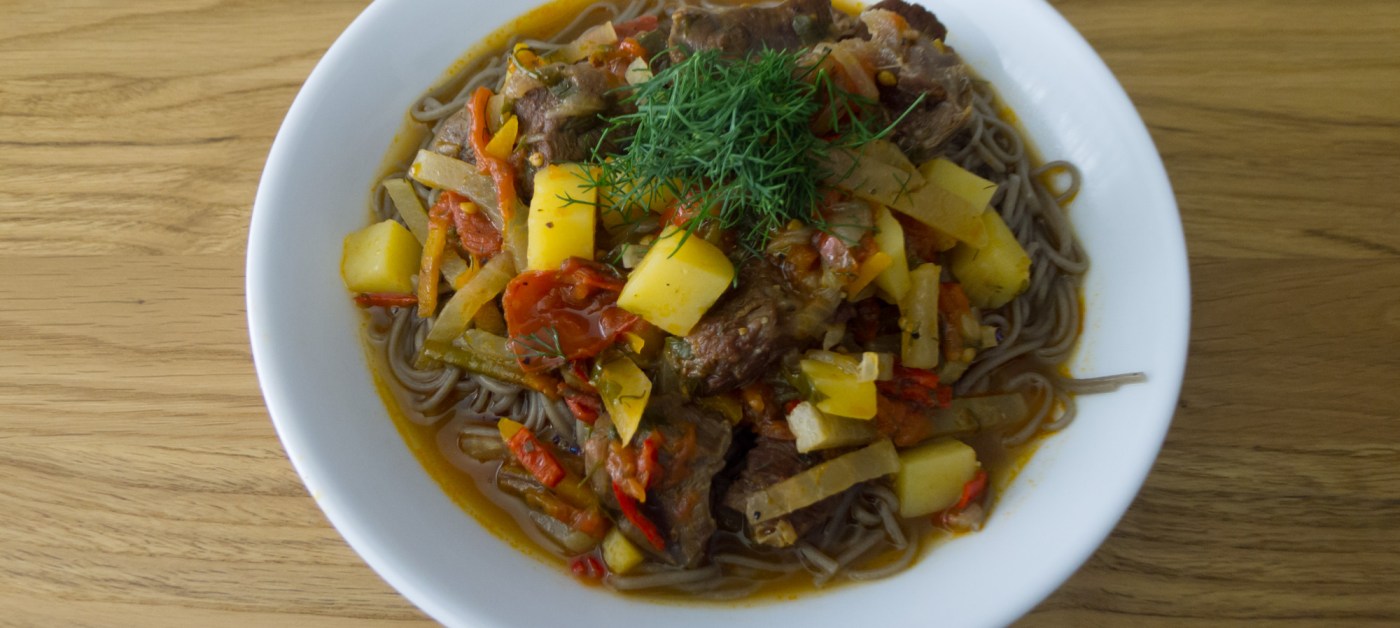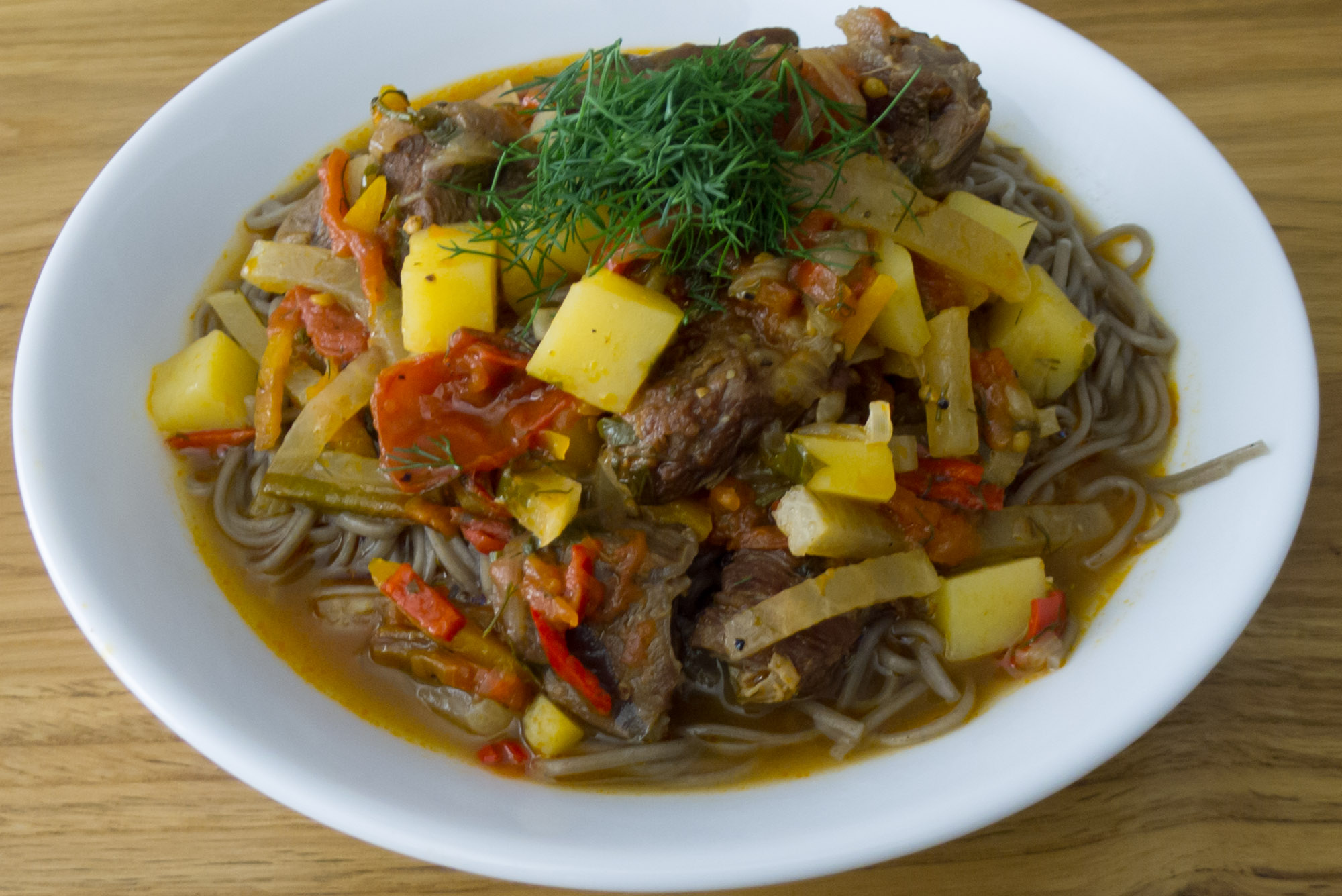 Dass der Name „Lagman“ vom chinesischen Lamian abgeleitet ist, was sich aus den zwei Zeichen für „gezogen“ und „Nudel“ zusammensetzt, und somit eher die Nudeln als den Rest des Gerichtes beschreibt hab ich erst viel später erfahren. Dass „echter Lagman“ mit handgezogenen Nudeln zubereitet wird, weiß ich theoretisch seit meiner Kindheit, praktisch gegessen habe ich es aber noch nicht. Im sowjetischen Kasachstan verwendeten wir Nudeln, die im Lebensmittelgeschäft offen verkauft und mit dem Namen Kuksi bezeichnet wurden. Ich versuche seit Jahren erfolglos herauszufinden woraus sie bestanden. Sie hatten eine gräuliche Farbe und waren lange wirre Stränge. Ich glaube nicht, dass es sie aus Weizenmehl hergestellt wurden – Glasnudeln waren es aber auch nicht, wahrscheinlich eine Mehlmischung, möglicherweise mit Buchweizen. In Deutschland angekommen, wurden die Nudeln für dieses Gericht munter durch Spaghetti oder dünne Nudelnester ersetzt. Ich finde, dass die japanischen Soba aus Buchweizenmehl hervorragend dazu passen. Letztlich kann sich jeder selbst aussuchen, welche lange Nudeln er oder sie dazu essen will.