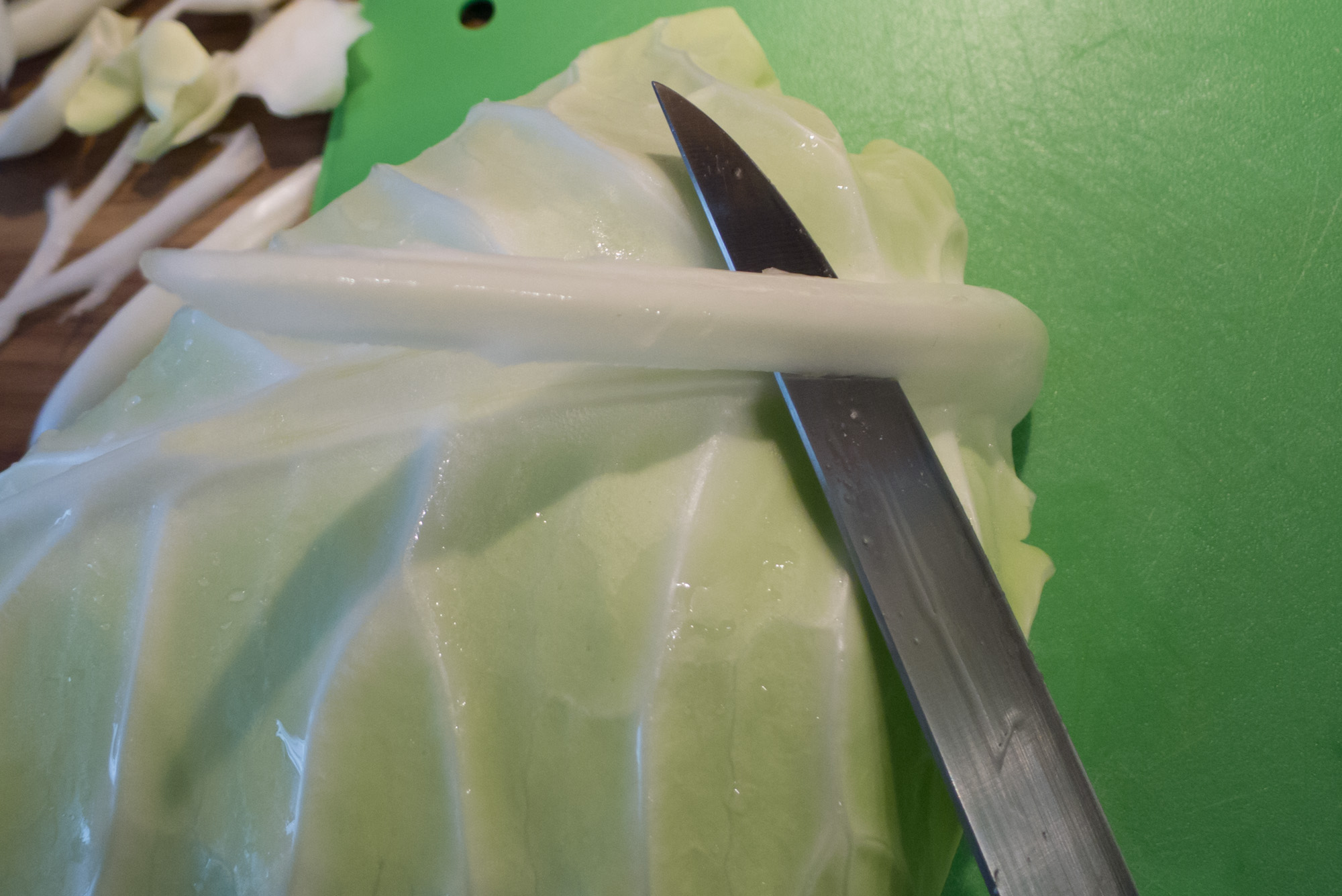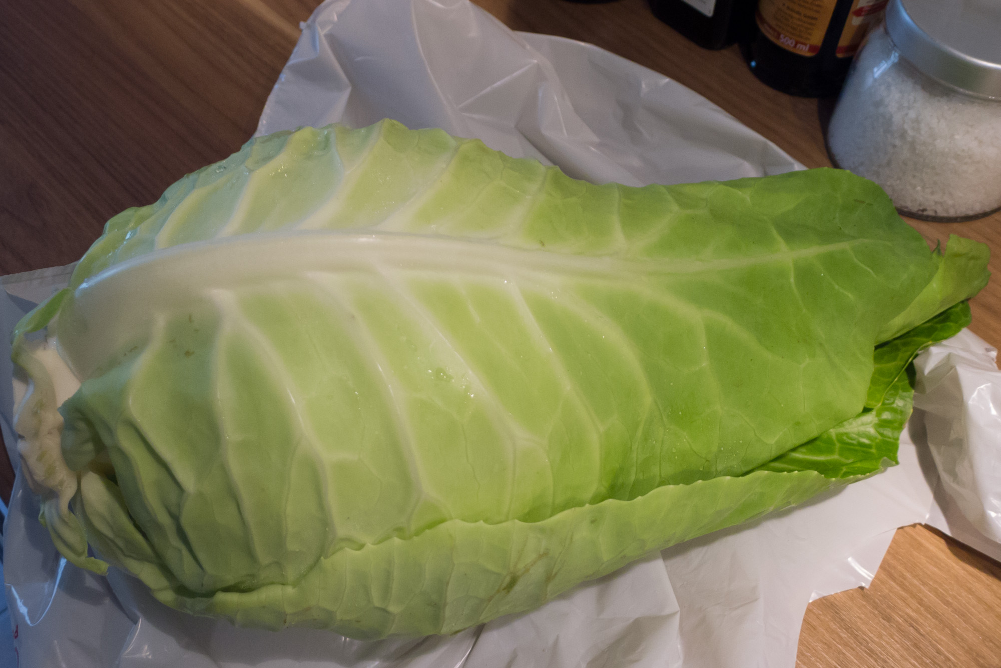Theoretisch kann man jeden Kohlkopf zu Kohlrouladen verarbeiten. Praktisch kann ich nur empfehlen, eine Sorte zu wählen, die locker ist, sodass sich die einzelnen Blätter unbeschadet vom Kopf trennen lassen. Und Geschmack sollte der Kohl auch haben. Ich persönlich mag den Spitzkohl sehr, er hat gerade auf den heimischen Feldern Saison und ist auf den Märkten in guter Qualität und Frische zu haben. Wer den 0-8-15 deutschen „Standard-Weißkohl“ verwenden will, sei gewarnt: es ist ein langwieriger und schwieriger Prozess, seine Blätter auseinander zu bekommen (meist nur mit mehrstufigem Blanchieren des gesamten Kopfes hinzukriegen), er braucht länger um gar zu werden und bleibt trotzdem irgendwie zäh… gleichzeitig hat er kaum Geschmack.
