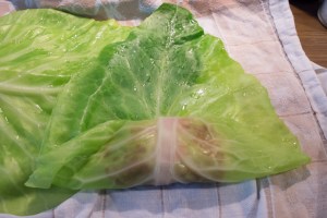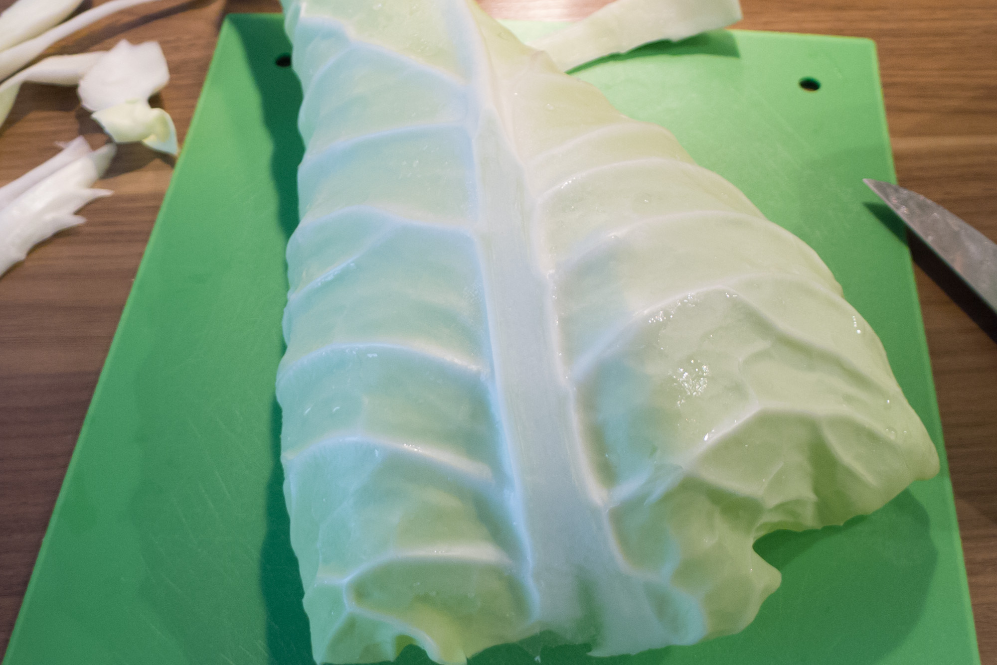 In der Zwischenzeit 10 große Blätter vom Kohl lösen. Jeweils die große Rippe flach schneiden.