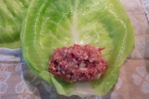 Nun die vorbereiteten Kohlblätter jeweils mit der Fleisch-Reis-Zwiebelmasse füllen, dabei am besten so vorgehen: