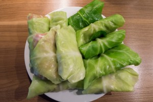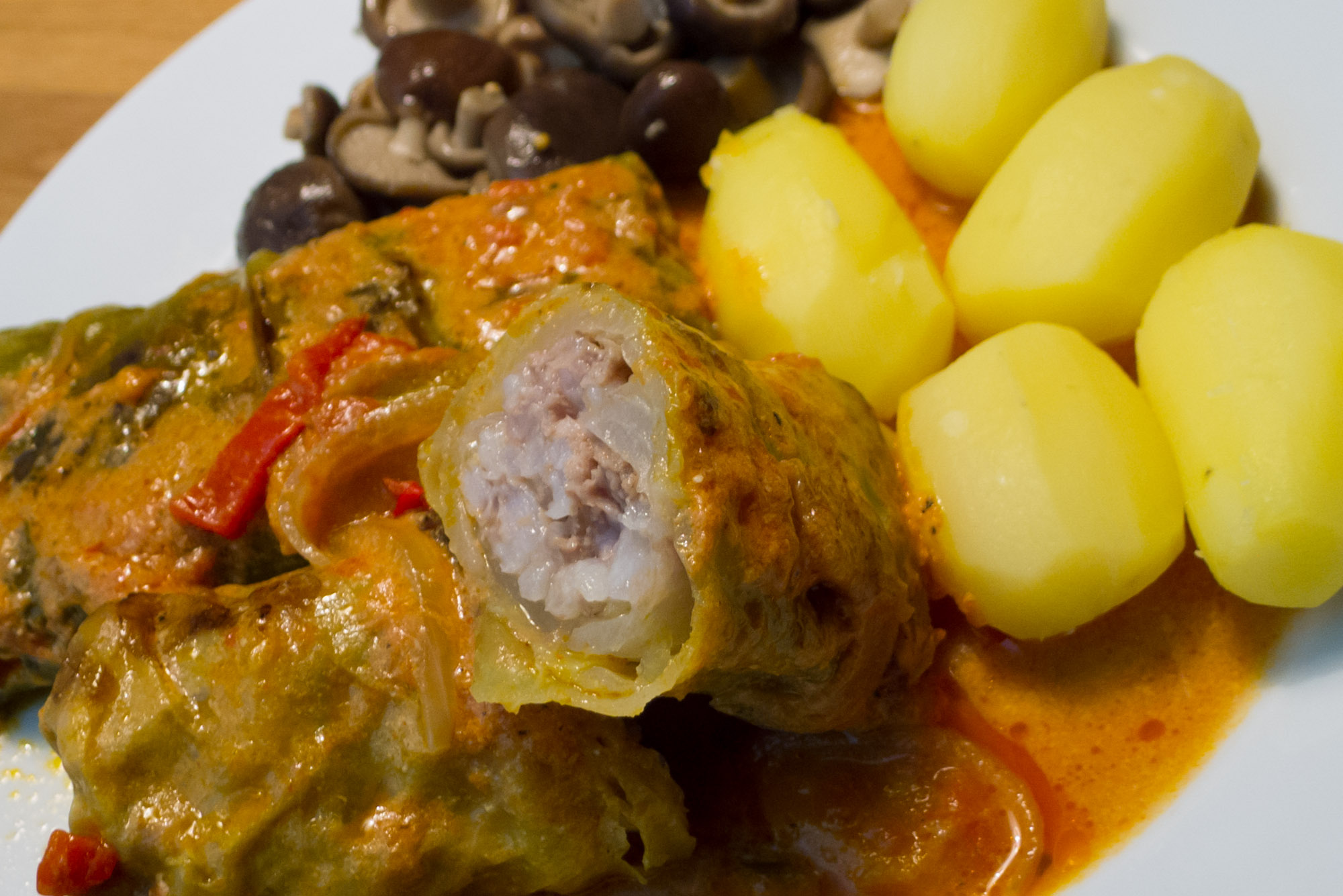 Mir wurde gestern vom Markt ein wunderschöner großer Spitzkohl mitgebracht, der förmlich danach schrie, zu Kohlrouladen verarbeitet zu werden. Ich hatte schon seit geraumer Zeit Hunger auf die Kohlrolladen meiner Kindheit. Dieses Familienrezept hat nichts mit den deutschen Kohlrouladen oder Krautwickeln in brauner Sauce und mit Brot in der Fleischfüllung zu tun. Es entlehnt sich eher den russischen Голубцы in tomatig-sahniger Sauce. Das Gericht hat auch eine Ähnlichkeit zur gefüllten Paprika die ich vor ca. 2 Jahren gepostet habe. Das Gericht erfordert jedoch etwas Arbeit und man braucht einen guten Kohlkopf, deswegen habe ich es schon lange vor mir hergeschoben die Rouladen zu machen.