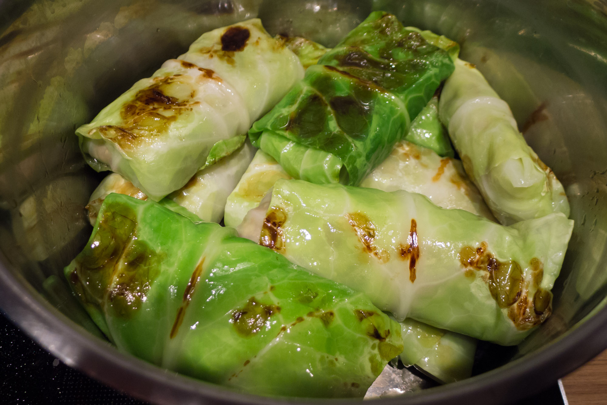 Nun etwas Butterfett oder Öl in einer großen Pfanne erhitzen, die Kohlrouladen darin von beiden Seiten kurz scharf anbraten und in einen großen Topf schichten.