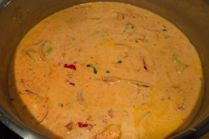 Die evtl. geformten Klöpse dazulegen. Nun die beiseitegestellten Zwiebeln mit den Paprika- und Karottenstreifen in die Pfanne geben und gut anbraten. Die passierten Tomaten und etwa 200 ml Wasser dazu geben, das ganze zum Kochen bringen. Salz, Pfeffer, Chilli nach Geschmack und die Lorbeerblätter hinzufügen. Die Petersilie waschen, schneiden und hinzufügen. Nach etwa 5 min die Pfanne vom Herd nehmen. Den Sauerrahm mit der Sahne cremig rühren und unter den Pfanneninhalt rühren.