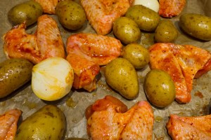 Die Hähnchenflügel nochmals durchmischen und auf ein mit Backpapier belegtes Blech verteilen. Die Kartoffeln und halbierte Zwiebeln in die Marinierschüssel geben, ggf. noch einen Schuss Öl hinzufügen, so dass das Gemüse jeweils gering mit Öl benetzt ist. Dann auch auf dem Blech verteilen.