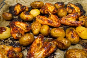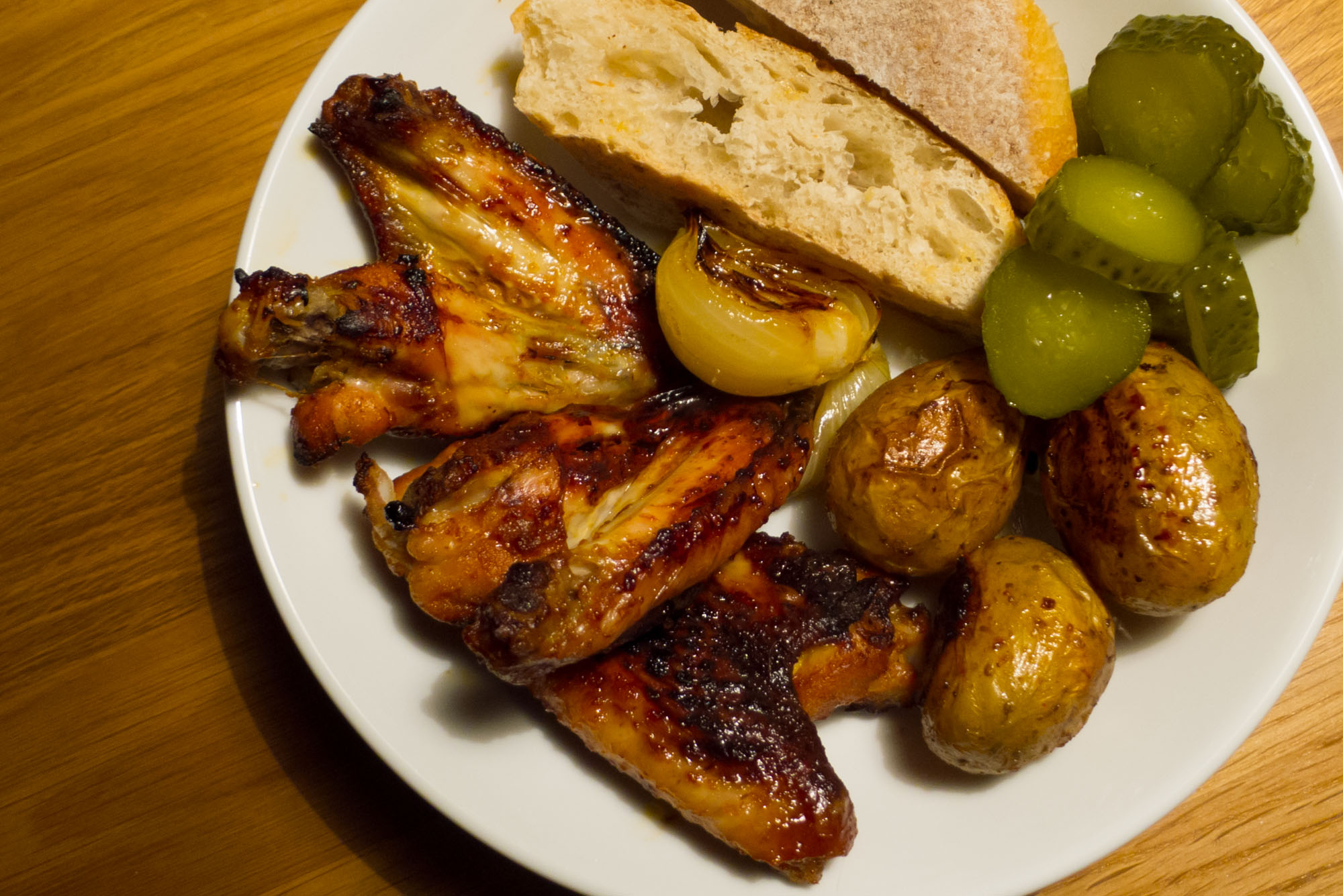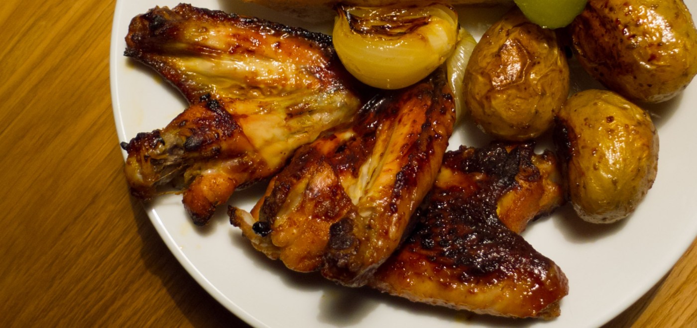 Man sollte dabei nur einige Regeln beachten. Gute Chicken wings haben eine knusprige Haut – um die zu bekommen braucht es eine karamelisierende Zutat in der Marinade (Zucker, Honig, Agavendicksaft o.ä.) und genug Zeit im heißen Ofen. Das letztere führt auch dazu dass das Fleisch gut durchgegart ist und praktisch vom Knochen fällt. Das ist auch schon alles.