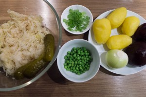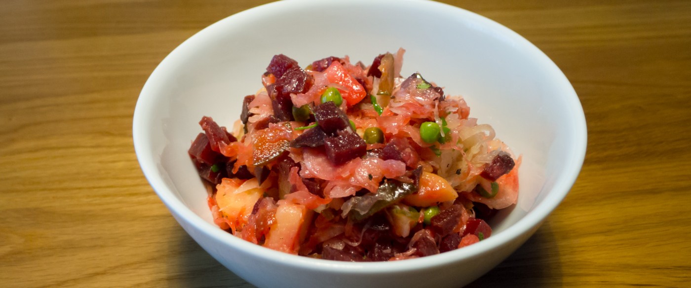 Unter Vinaigrette versteht man im Westen ein französisches Salatdressing, in Russland (und der ehemaligen Sowjetunion) ist Винигрет ein winterlicher Salat mit u. a. Sauerkraut, roter Beete, Kartoffeln. Ob die beiden zufällig Namensvetter sind oder eine sonstige Verbindung haben sollen, konnte ich bisher nicht herausfinden (der russische Salat wird zumindest auch nicht mit dem französischen Dressing angemacht sondern lediglich mit etwas Öl). Bei der jahrhundertelang andauernden Vorliebe der Russen für alles Französische verwundert der französisch klingende Name jedoch nicht.