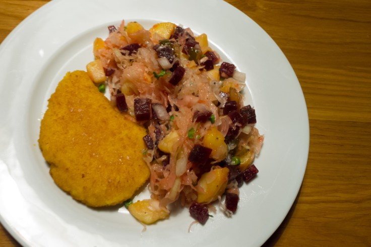 Im Sommer, wenn kein frisches Sauerkraut verfügbar ist, habe ich stattdessen auch schon gekauften Krautsalat aus der Kühltheke verwendet – das schmeckt zwar anders aber auch nicht schlecht.