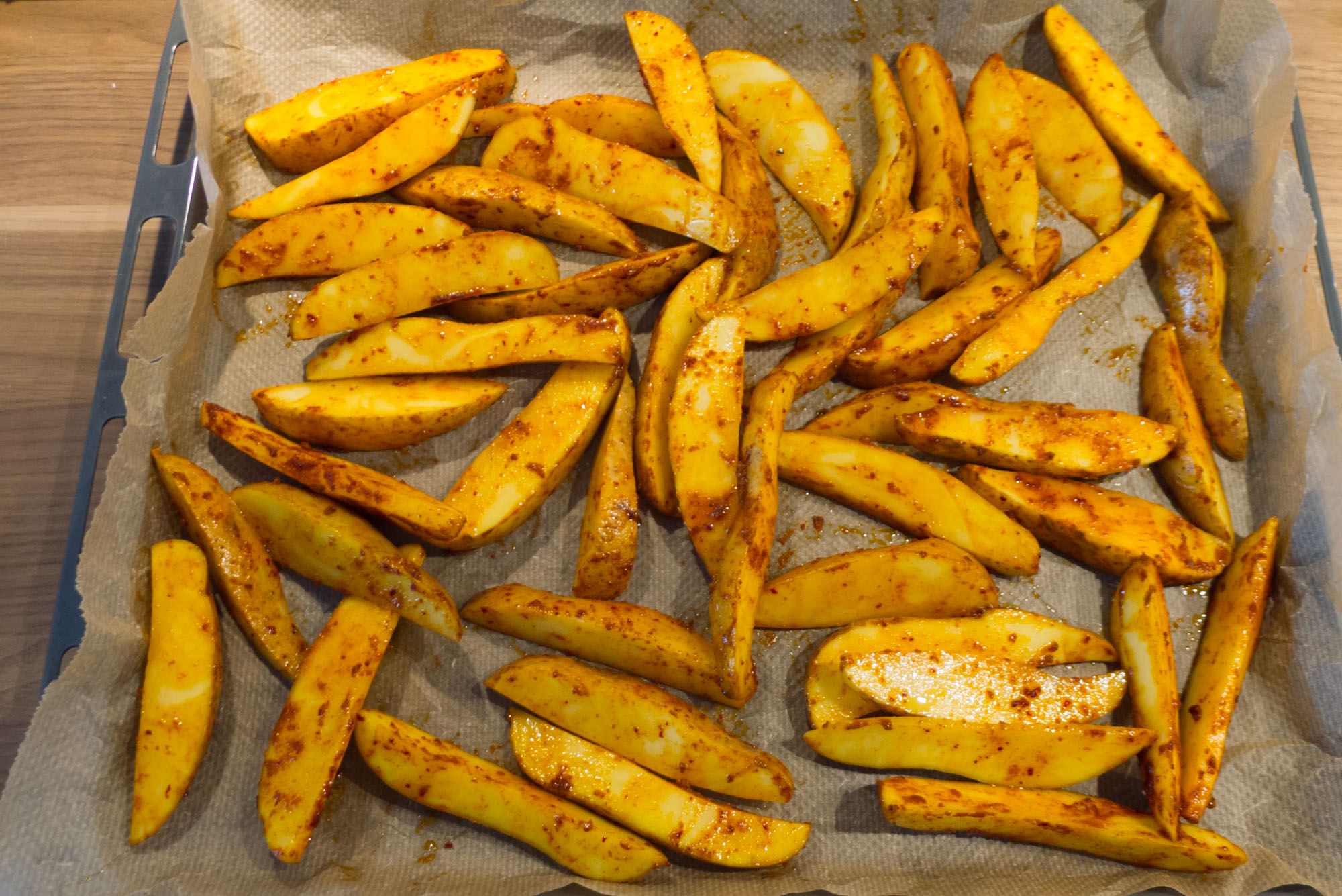 Öl und Gewürze hinzufügen und so lange gut durchmischen, bis die Kartoffelspalten allseits bedeckt sind. Nun auf ein mit Backpapier ausgekleidetes Blech geben, dabei möglichst in einer Schicht verteilen.